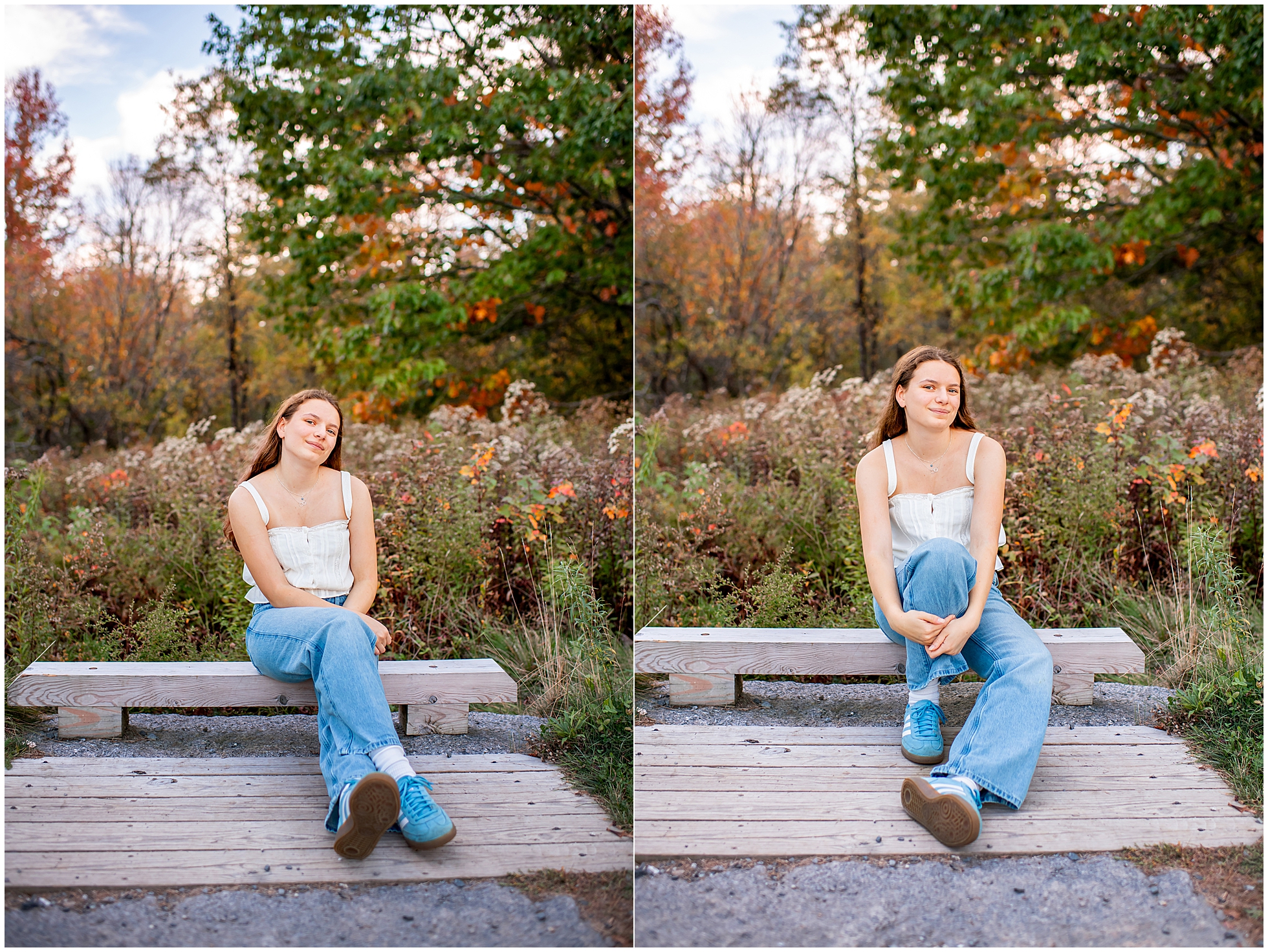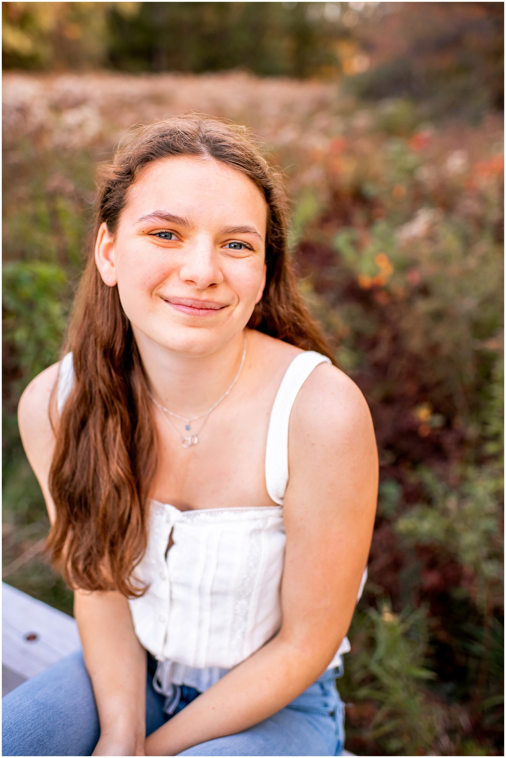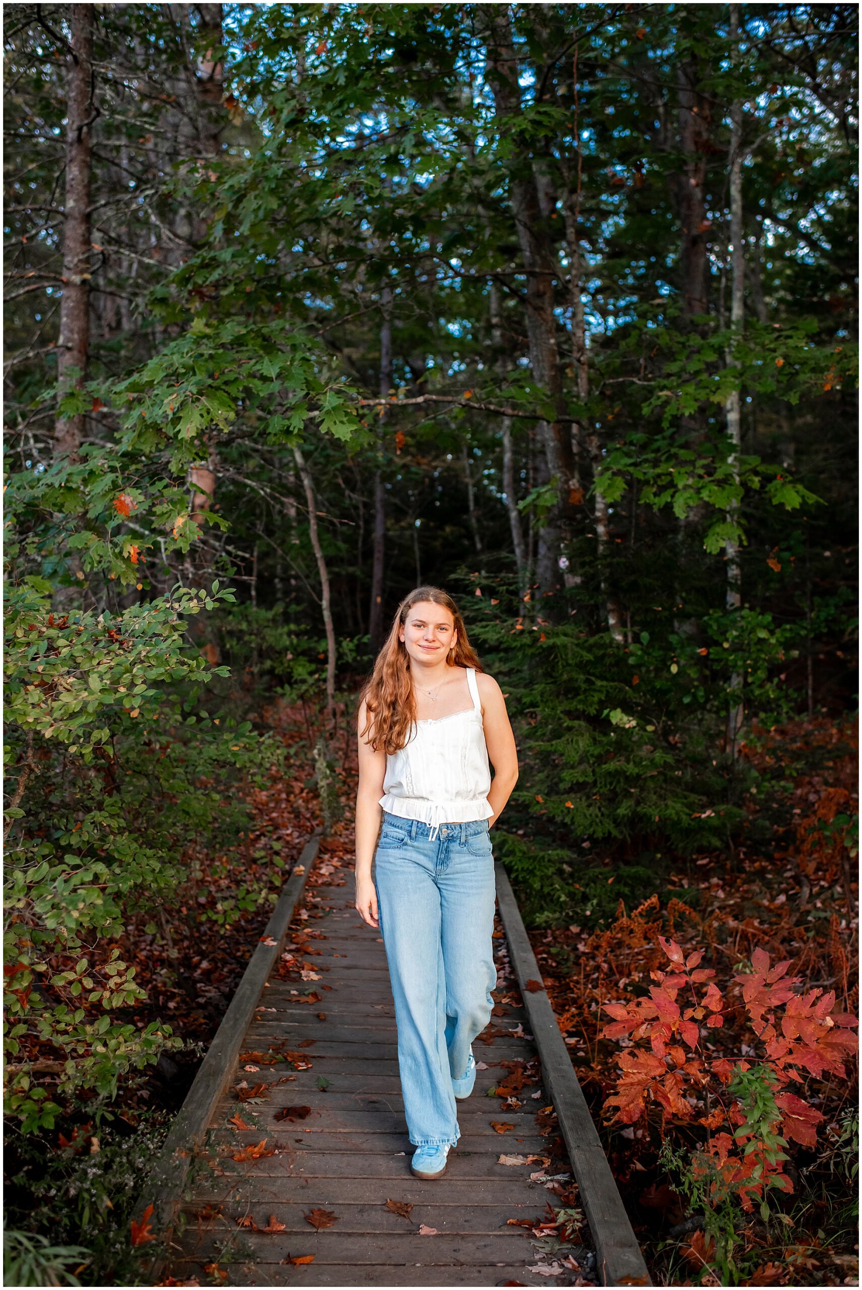 I’m so thrilled to be sharing Mira’s senior photos today! Mira is a member of Freeport High School’s Class of 2026, and we met up here in Yarmouth in early October for her senior photos. I have a special place in my heart for theater kids, having one at home myself, so when I found out Mira is Freeport’s stage manager for their theater program, I instantly knew I would like her – and I was so right.