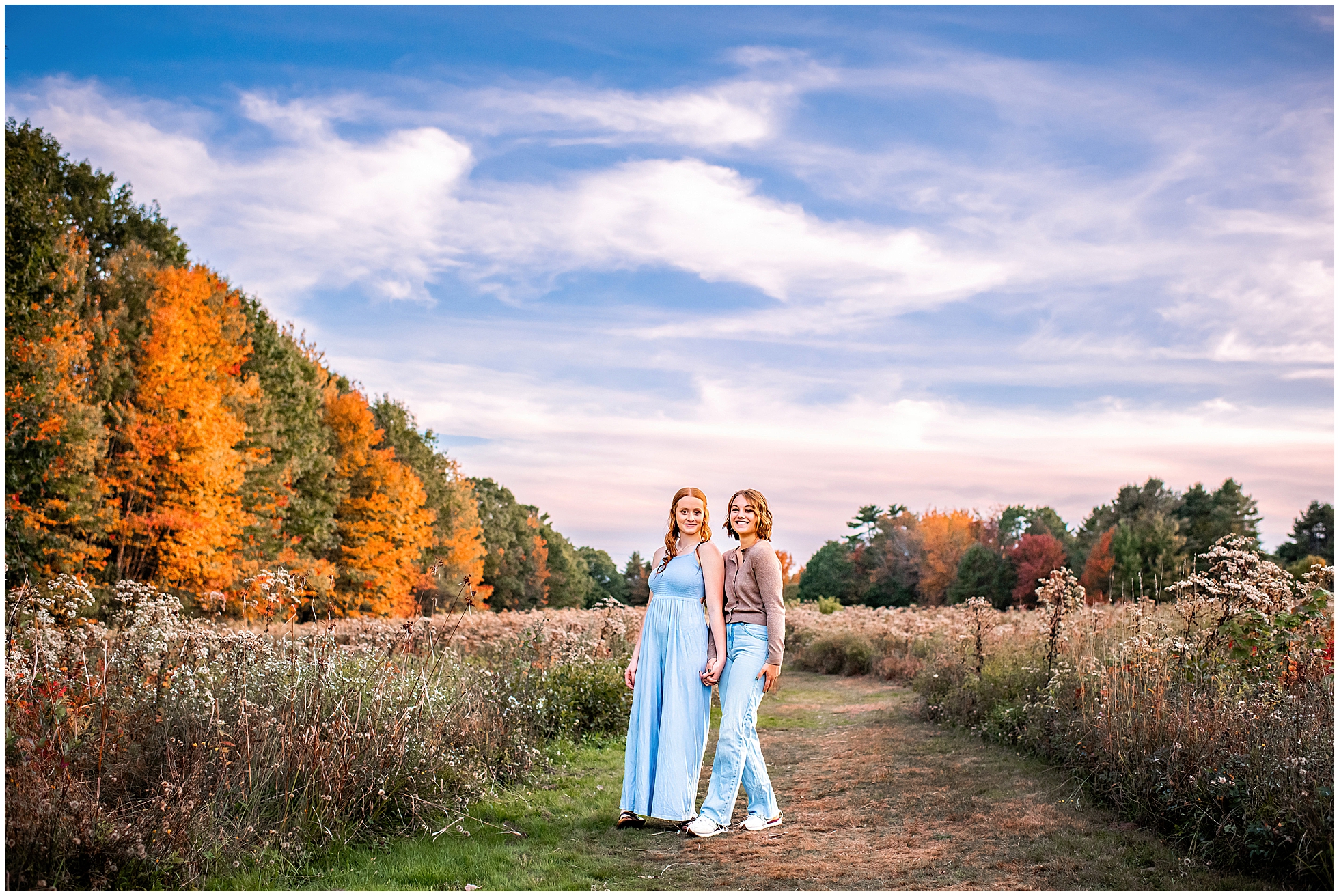 Oh I am so excited to share this senior session today with sisters Sophie and Nevaeh. I have photographed these girls since they were very little starting waaaaaay back in 2015 when I photographed their moms’ wedding. A few years later, I got to see them and their siblings and moms again on the shores of Pine Point Beach, and then fast forward seven years, one move to Montana and back to Maine, and I was THRILLED to get an email from their moms asking if I could take their senior photos. These two ladies are pretty darn special. They grew up in a home that opened its doors to foster children, meaning they have always been surrounded by many siblings (there were 8 at our Pine Point session!). So to take an evening September that was just about them, was really awesome.