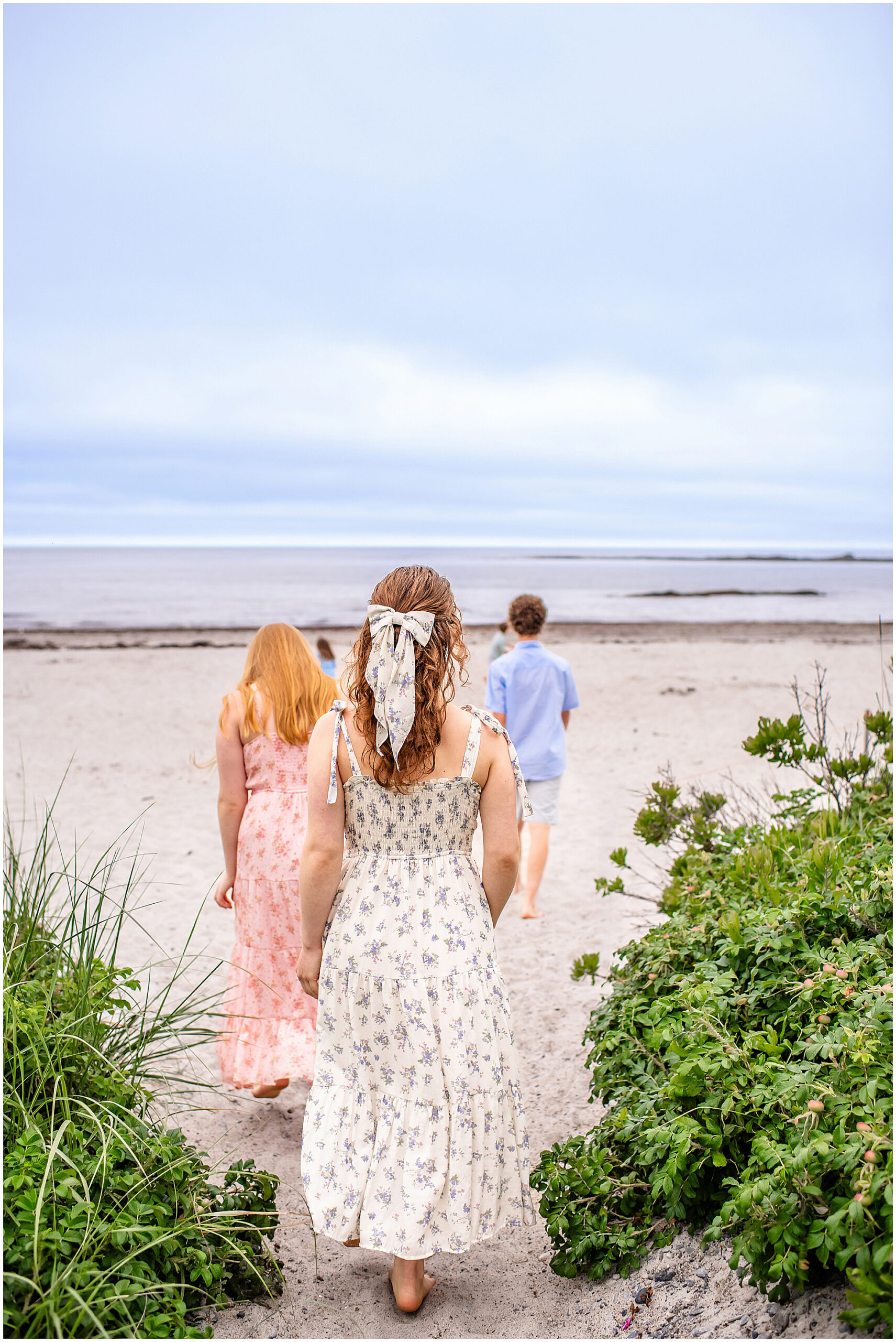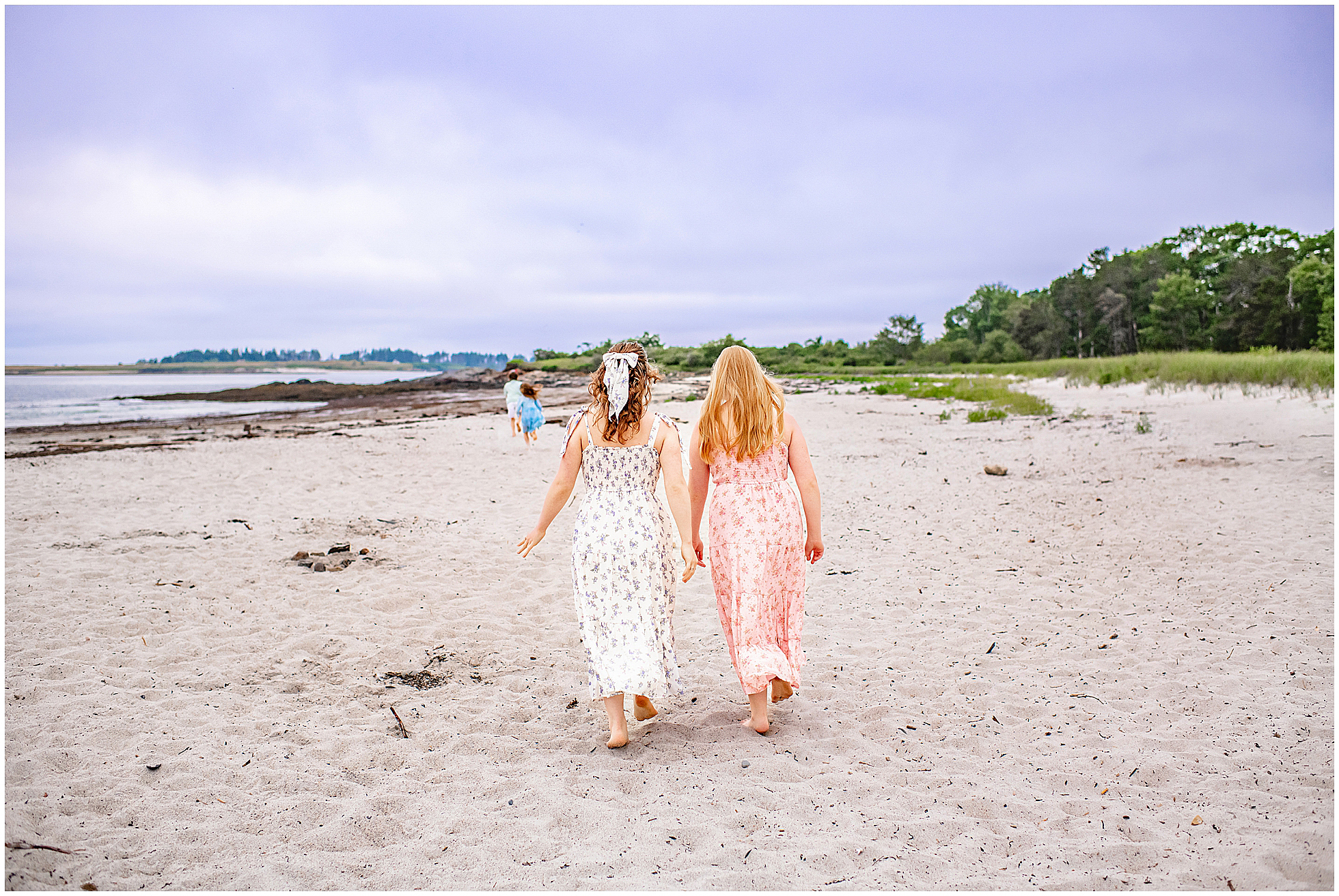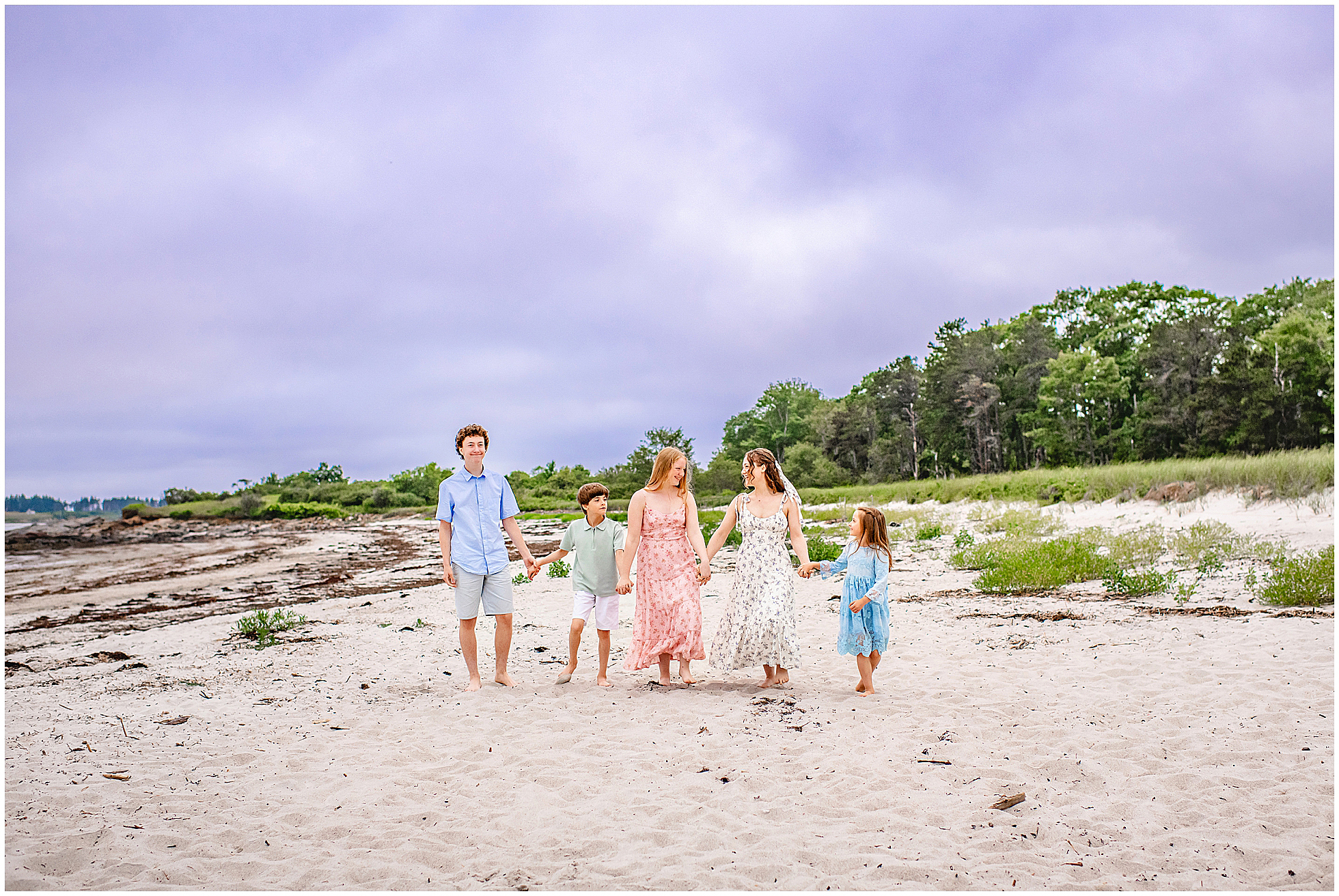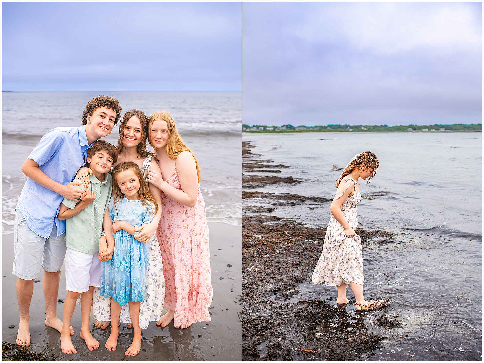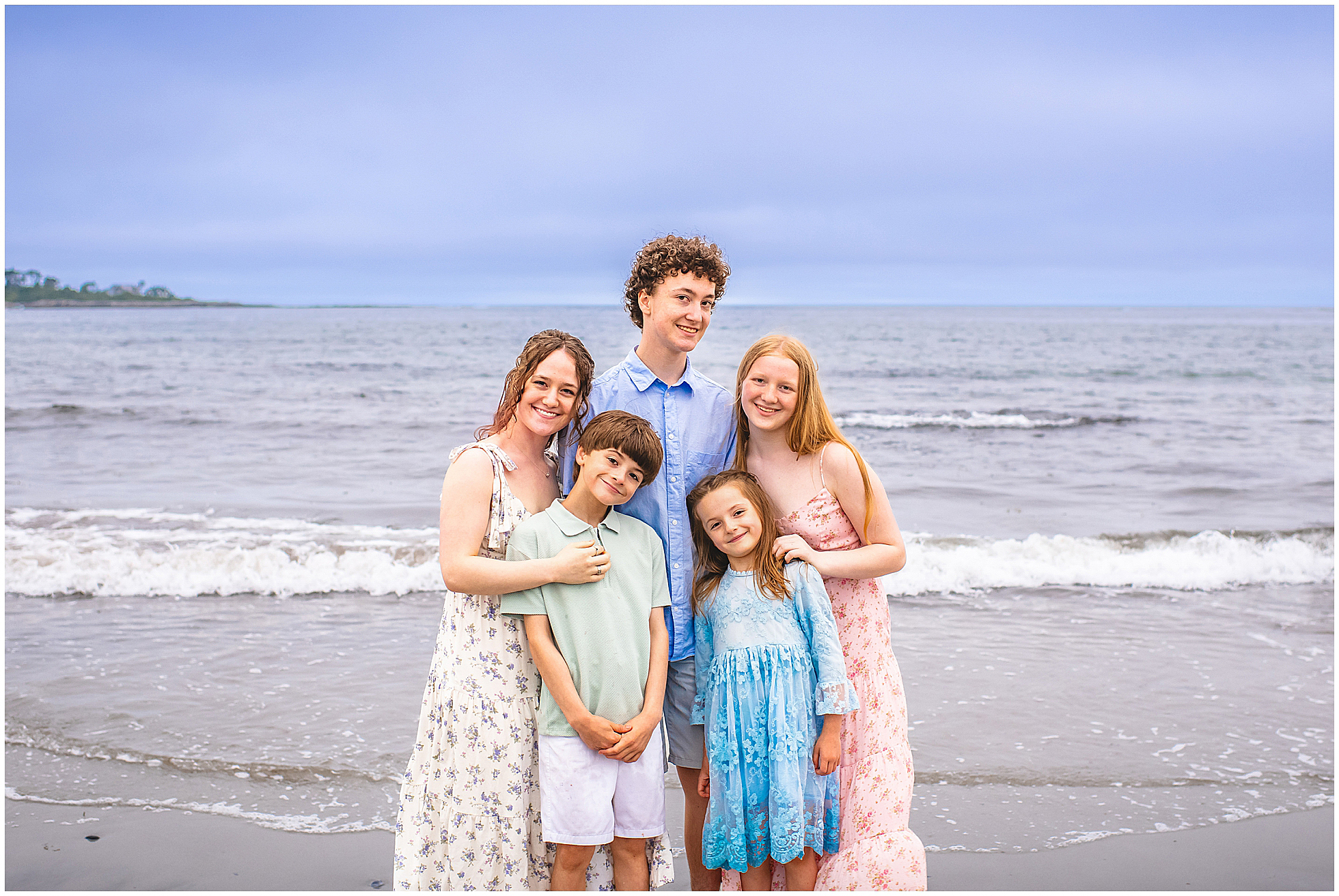 Ten whole years ago, I first met the B Family, and for a decade now I have had the extreme honor of capturing this family as they grow. This year was my 11th time photographing this crew, and one of my favorites. Each year our sessions mostly focus on the five kids – Ella, Ollie, Grace, Sully, and Poppy, and while I’m always amazed by how quickly everyone is growing up, this year felt even more remarkable. With Ella just completing her first year of college, I noticed how much Grace and Ollie have connected with their younger siblings, and while Sully and Poppy still ran circles around all of us, their goofy energy felt a little more grown up this year – a sure sign that this group as a whole is really transitioning into a mix of middle childhood, the teen years, and even adulthood. We headed to Crescent Beach this year, and I very much expected the beach to be socked in with fog as I was seeing on the webcam all day long. Instead we arrived to soft skies with minimal fog, and beautiful light that so well complimented the outfits and fun personalities of this family. This crew means so much to me and to continue to take their photos for over a decade now is an honor that is impossible to put into words. Here’s to another year of photo memories on the coast of Maine. 💕