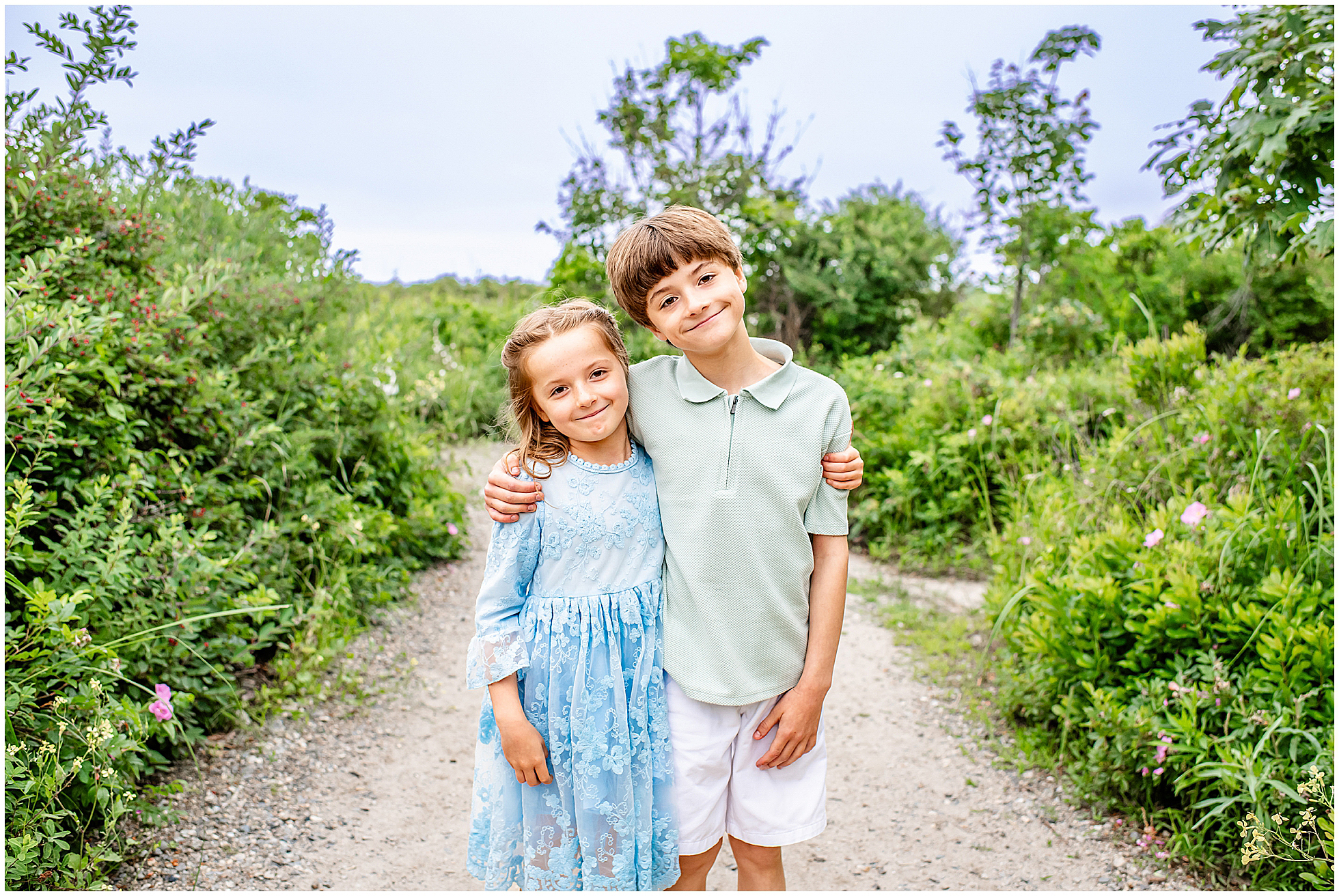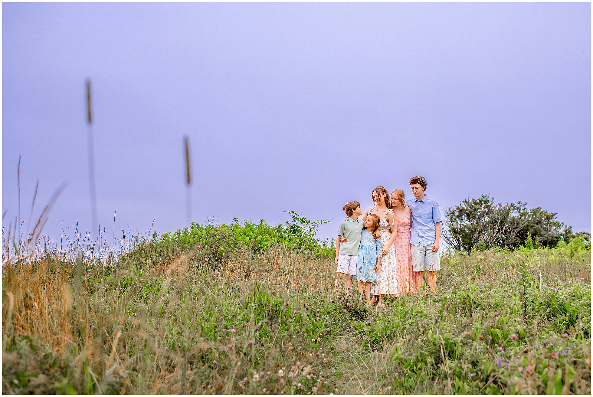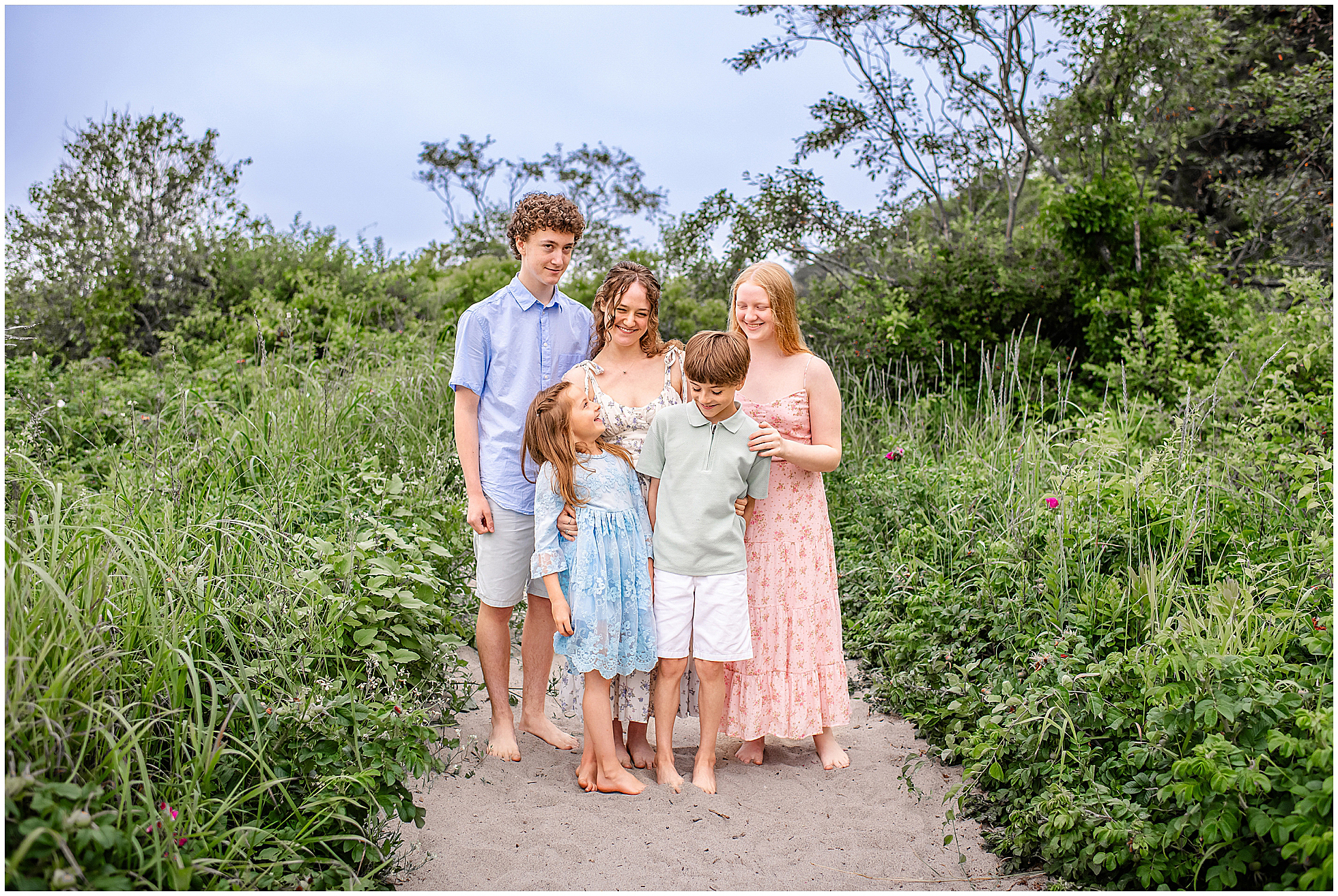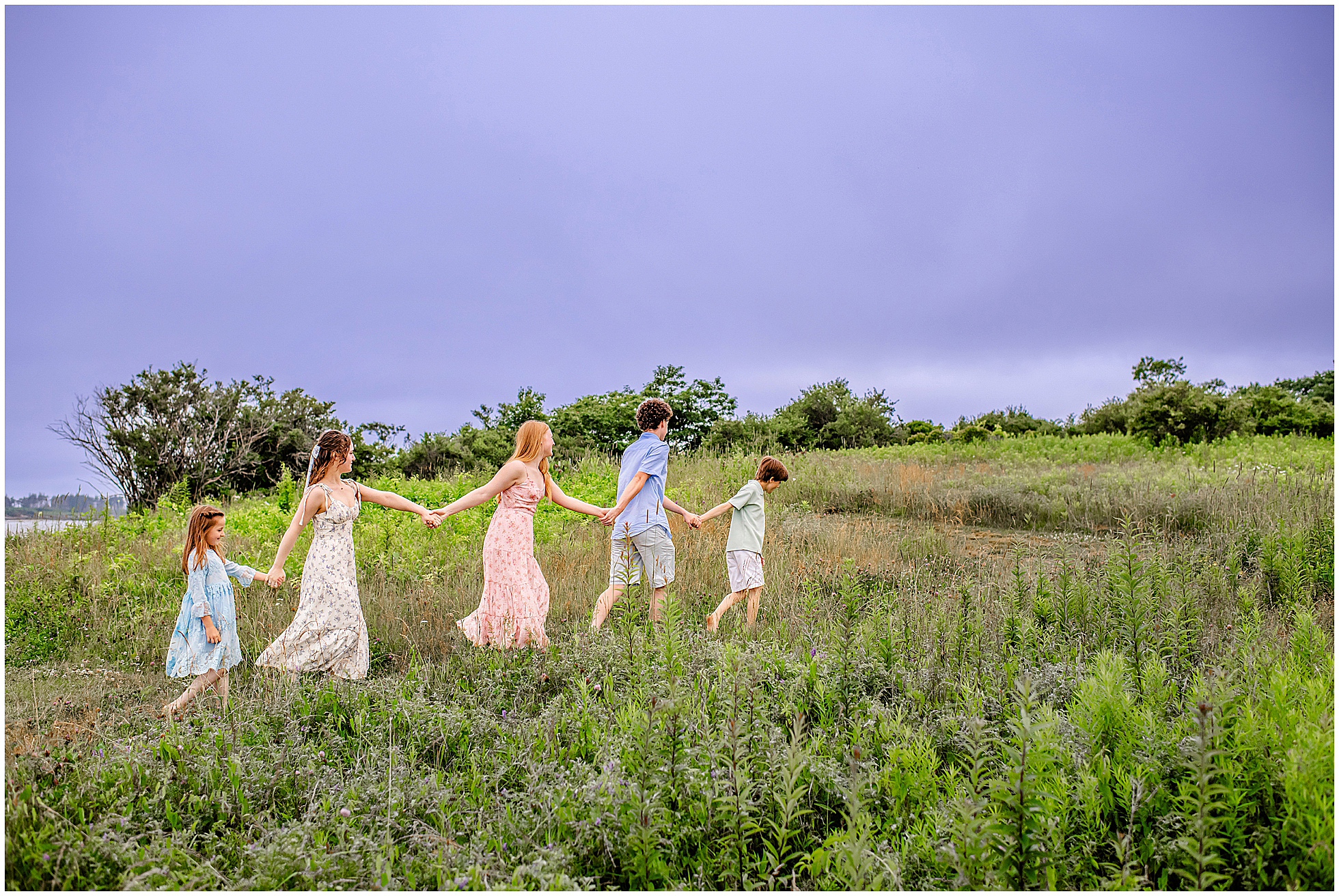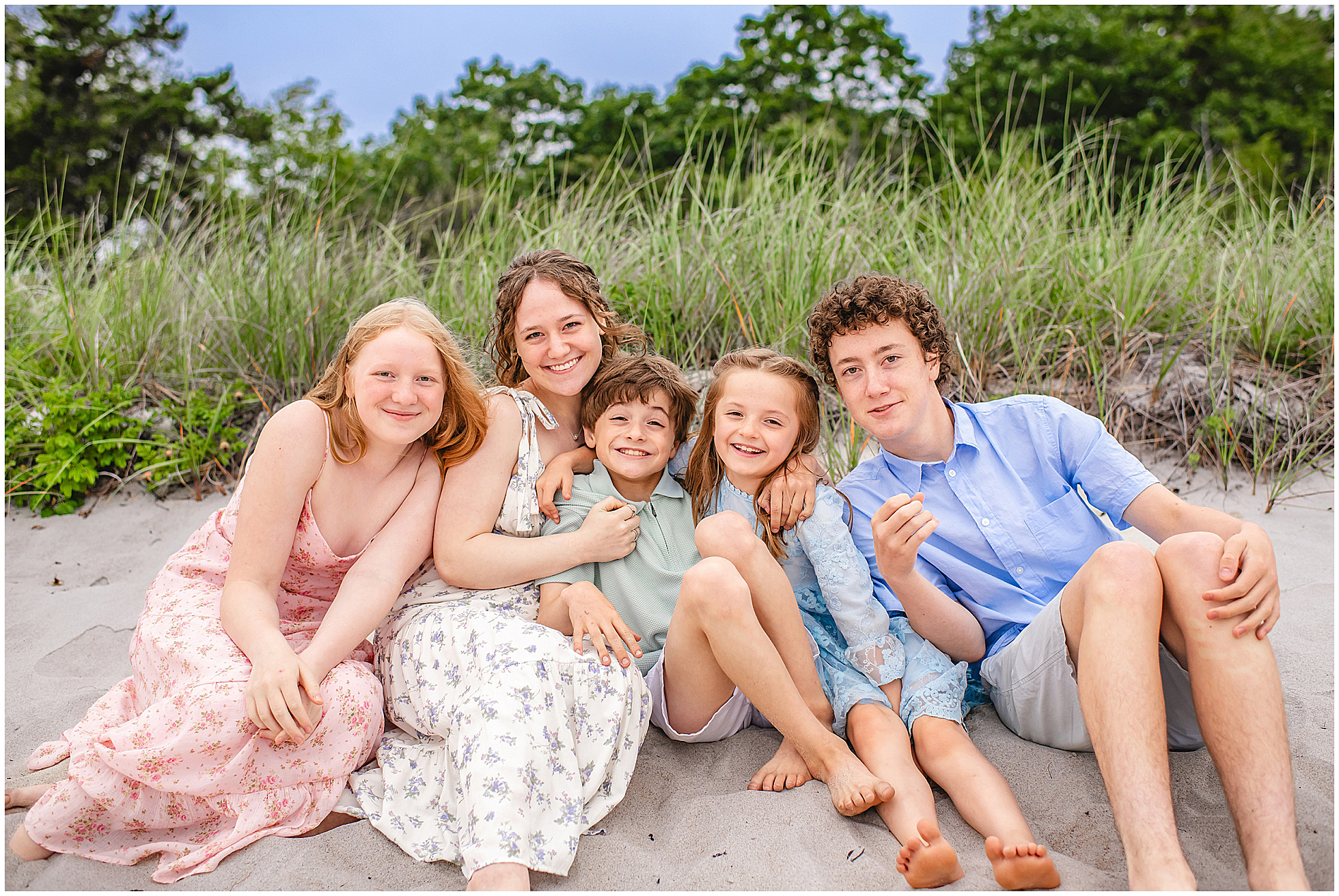 Ten whole years ago, I first met the B Family, and for a decade now I have had the extreme honor of capturing this family as they grow. This year was my 11th time photographing this crew, and one of my favorites. Each year our sessions mostly focus on the five kids – Ella, Ollie, Grace, Sully, and Poppy, and while I’m always amazed by how quickly everyone is growing up, this year felt even more remarkable. With Ella just completing her first year of college, I noticed how much Grace and Ollie have connected with their younger siblings, and while Sully and Poppy still ran circles around all of us, their goofy energy felt a little more grown up this year – a sure sign that this group as a whole is really transitioning into a mix of middle childhood, the teen years, and even adulthood. We headed to Crescent Beach this year, and I very much expected the beach to be socked in with fog as I was seeing on the webcam all day long. Instead we arrived to soft skies with minimal fog, and beautiful light that so well complimented the outfits and fun personalities of this family. This crew means so much to me and to continue to take their photos for over a decade now is an honor that is impossible to put into words. Here’s to another year of photo memories on the coast of Maine. 💕