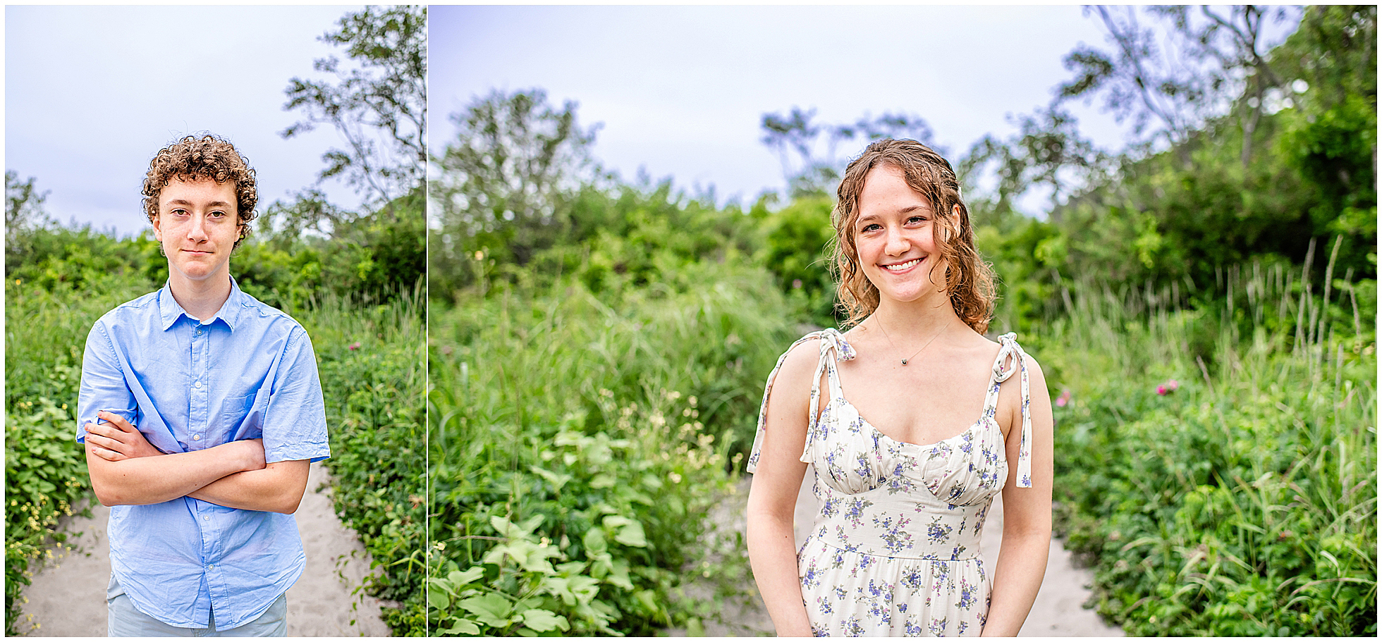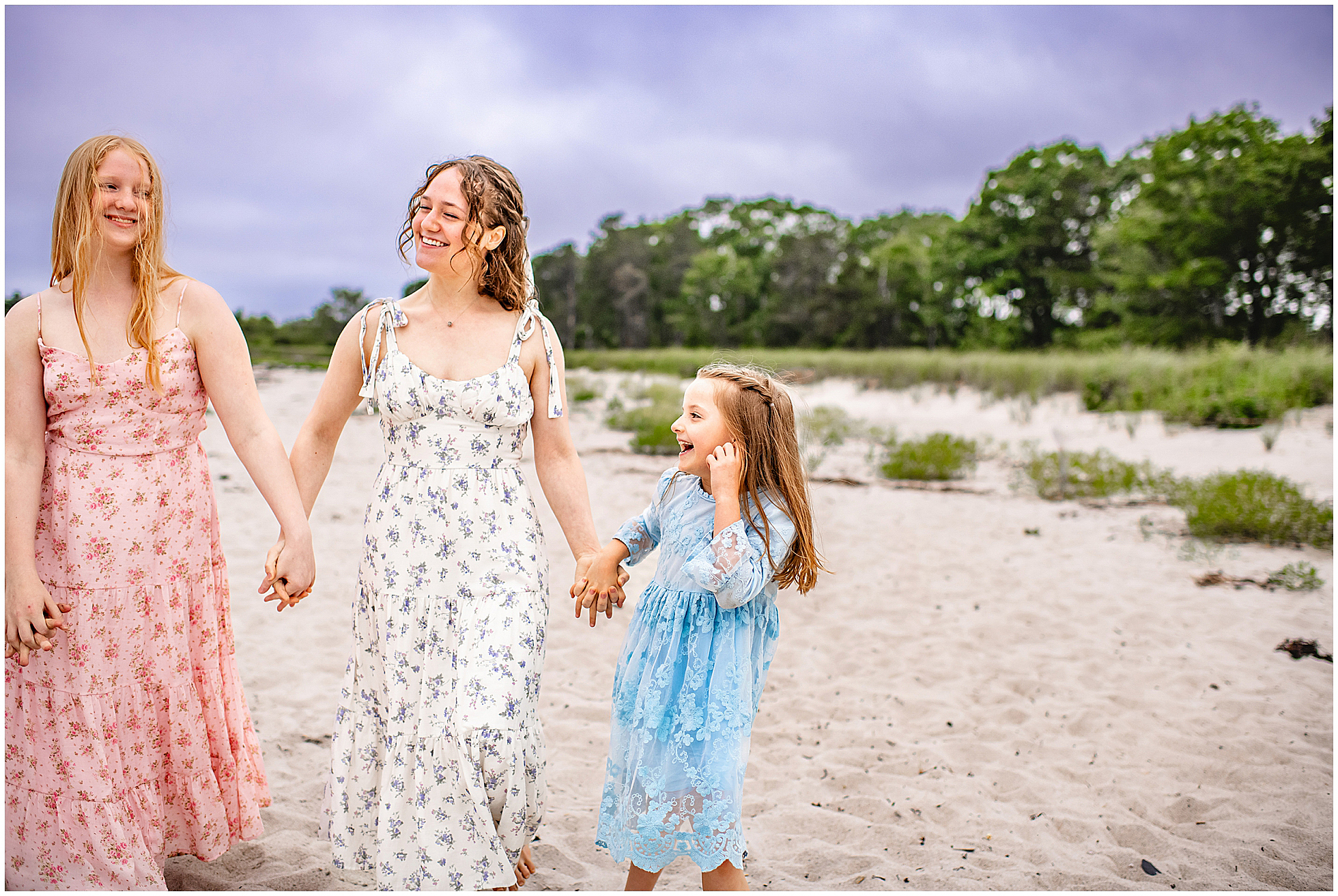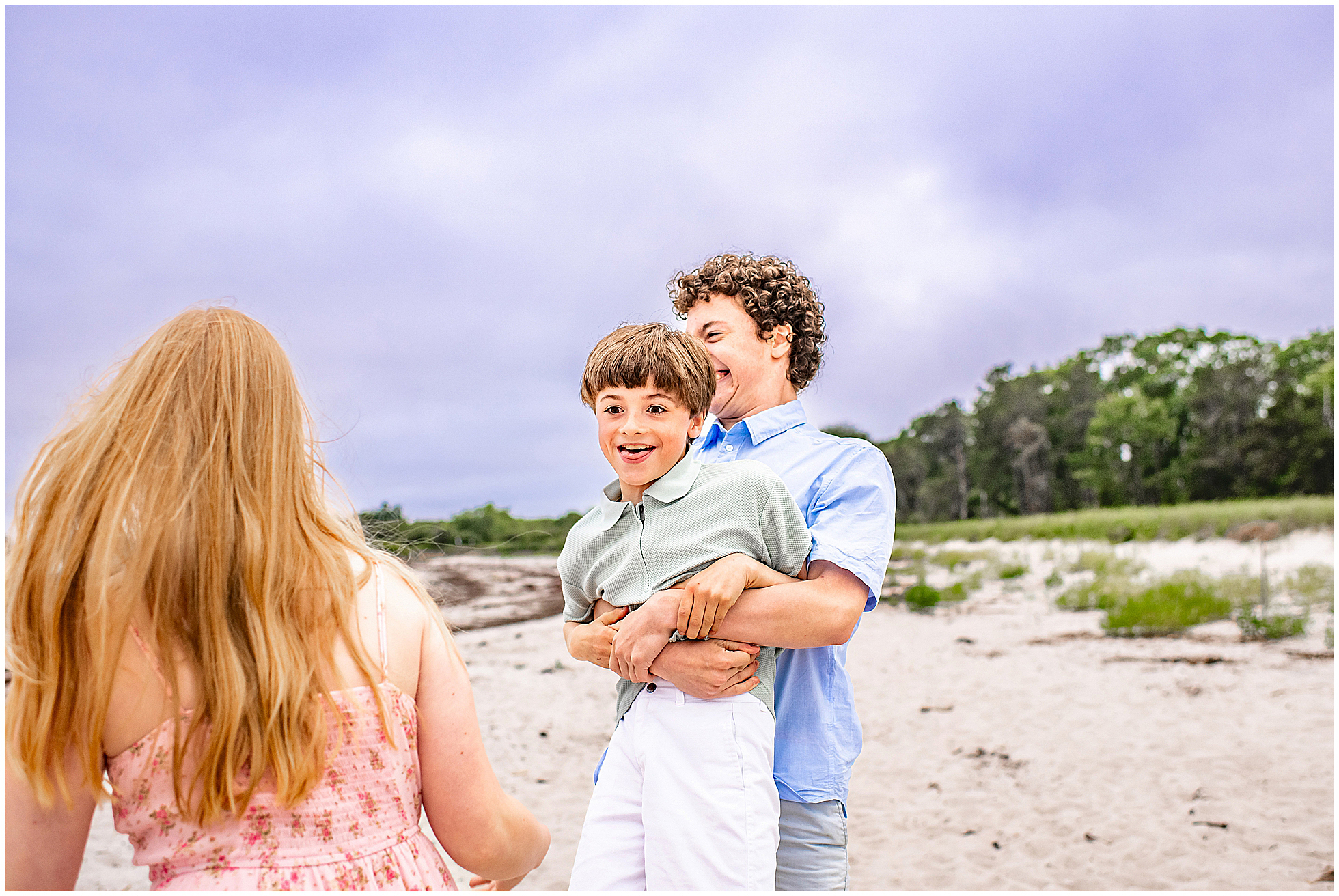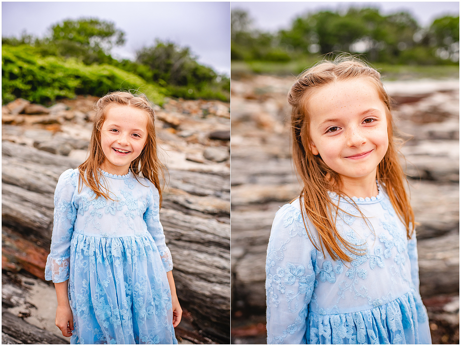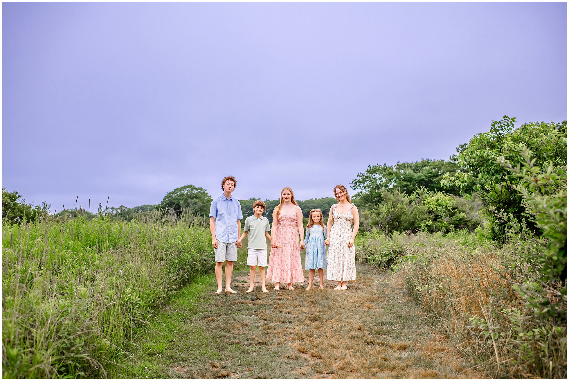 Ten whole years ago, I first met the B Family, and for a decade now I have had the extreme honor of capturing this family as they grow. This year was my 11th time photographing this crew, and one of my favorites. Each year our sessions mostly focus on the five kids – Ella, Ollie, Grace, Sully, and Poppy, and while I’m always amazed by how quickly everyone is growing up, this year felt even more remarkable. With Ella just completing her first year of college, I noticed how much Grace and Ollie have connected with their younger siblings, and while Sully and Poppy still ran circles around all of us, their goofy energy felt a little more grown up this year – a sure sign that this group as a whole is really transitioning into a mix of middle childhood, the teen years, and even adulthood. We headed to Crescent Beach this year, and I very much expected the beach to be socked in with fog as I was seeing on the webcam all day long. Instead we arrived to soft skies with minimal fog, and beautiful light that so well complimented the outfits and fun personalities of this family. This crew means so much to me and to continue to take their photos for over a decade now is an honor that is impossible to put into words. Here’s to another year of photo memories on the coast of Maine. 💕