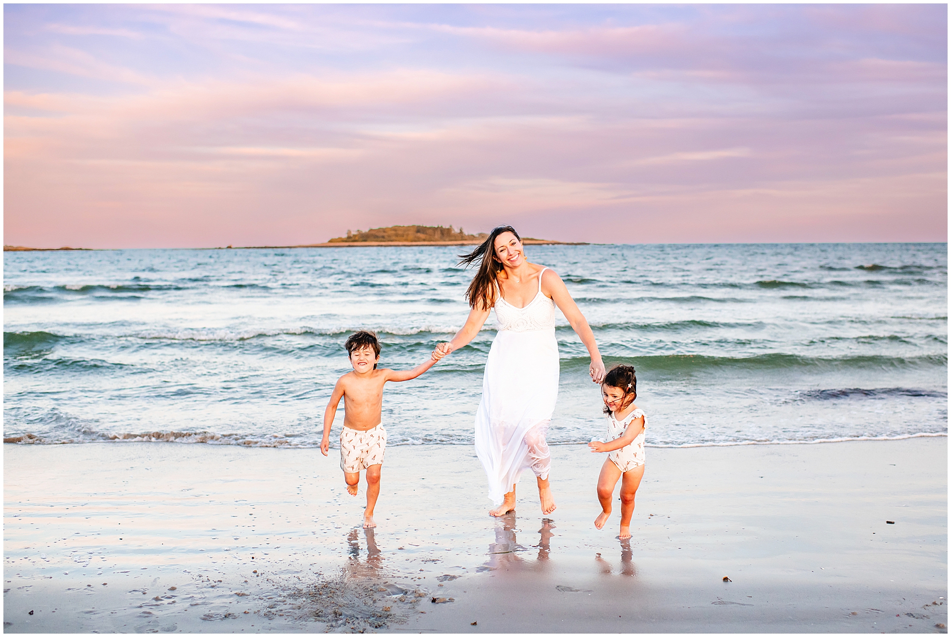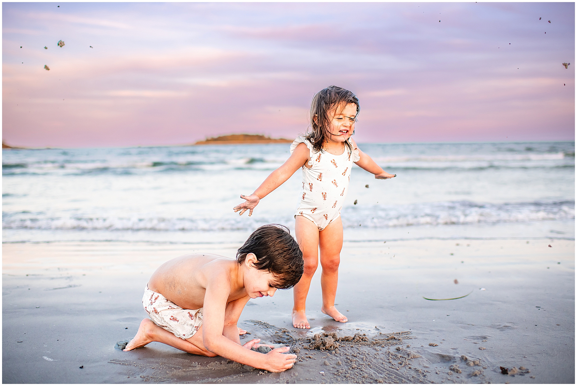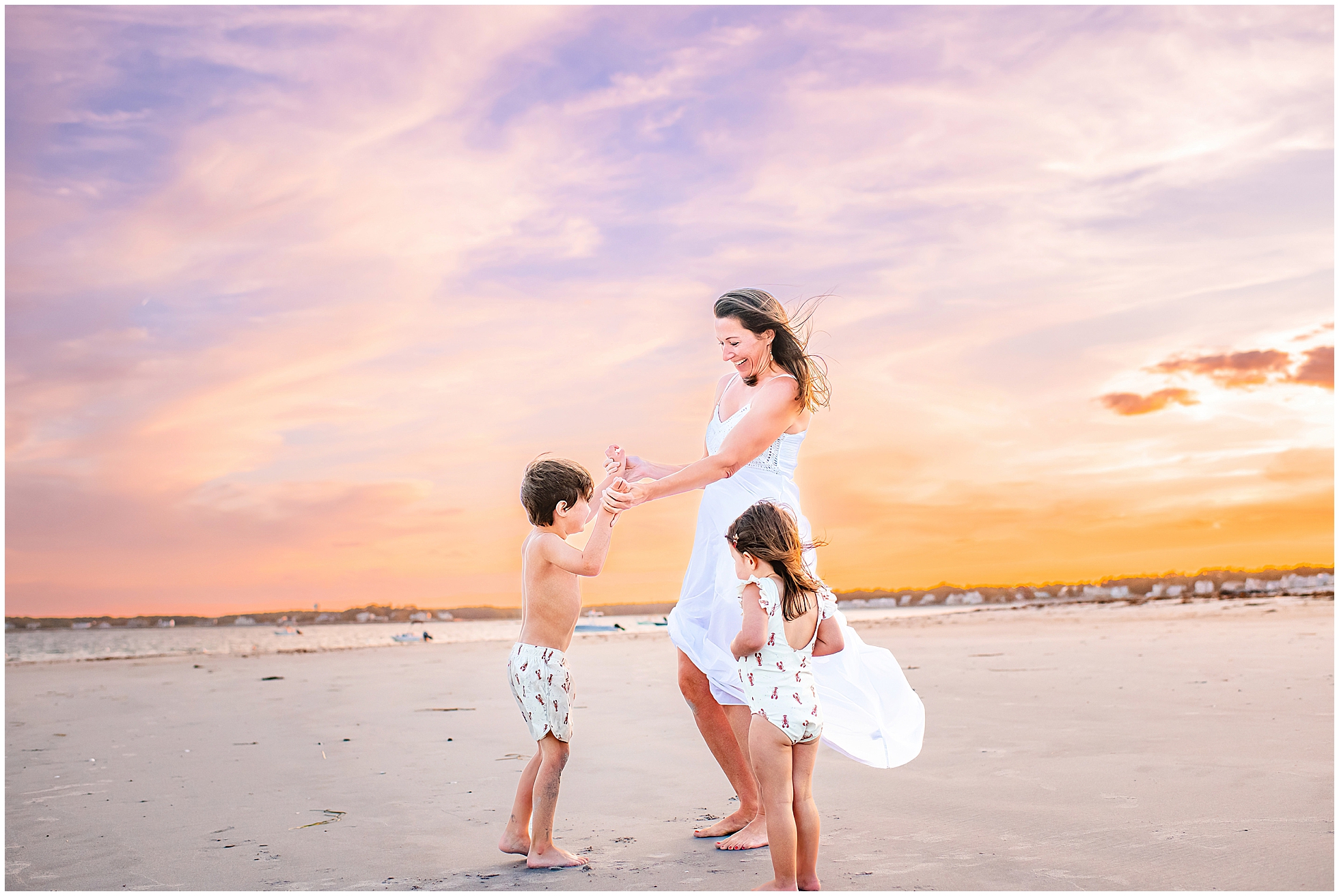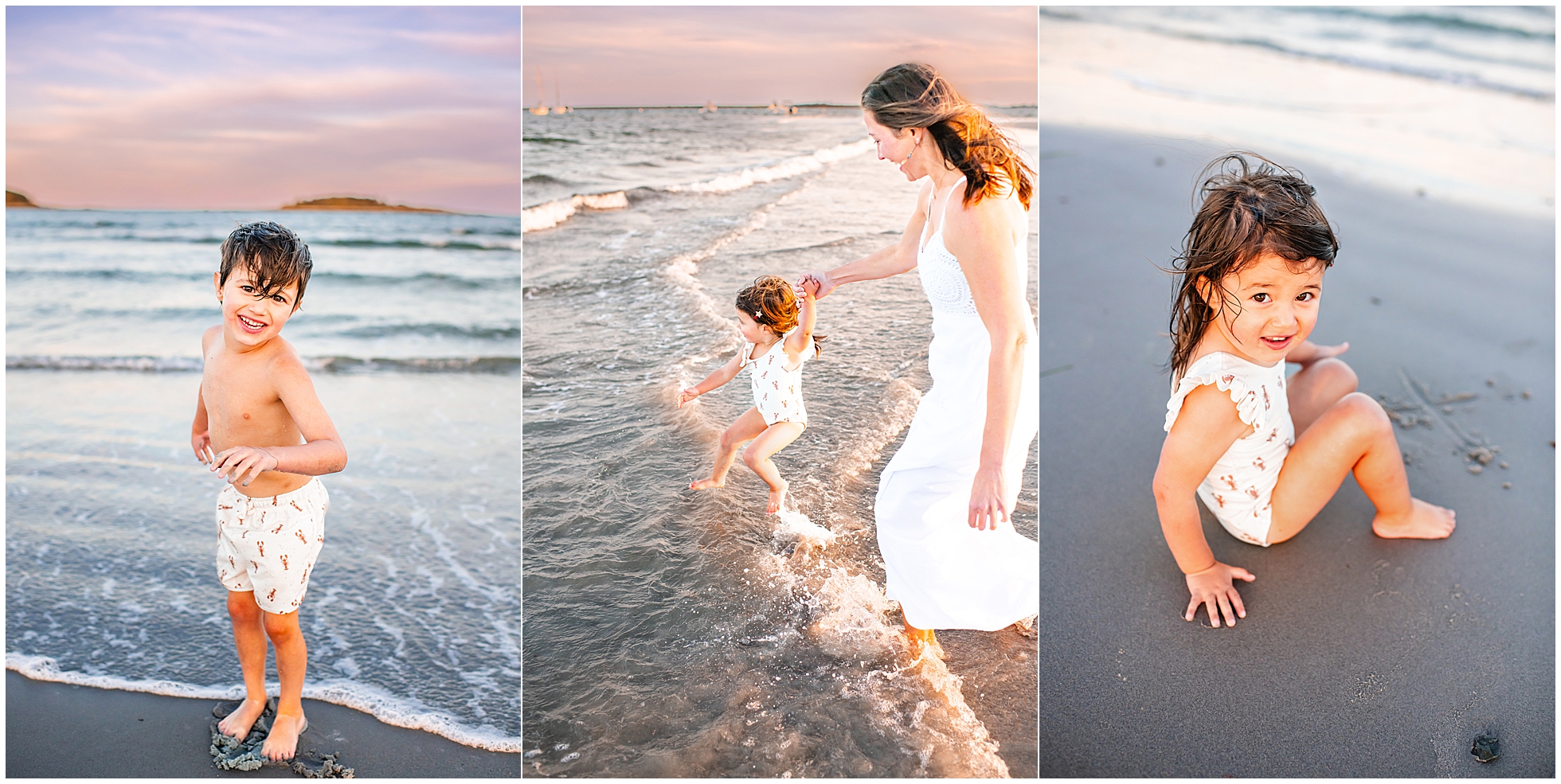 Back in 2020, I first met Caitlin and Mic at Reid State Park for their maternity photos. Since then I’ve had the pleasure of taking their photos several times, including Hugo’s newborn photos later that year, and Mila’s in 2023, with some fun family photos sprinkled in between as well. This summer Cait wanted super playful photos on the beach, and so we headed to Goose Rocks Beach in Kennebunkport for a night of photos in late August. Unfortunately Mic could not join us this year, and so we had an evening full of fun with mom. We started with some playfully posed photos, and then the kids changed into the cutest lobster bathing suits for some extended play time, with lots of running, splashing, and playing. We had a bright and beautiful Goose Rocks evening, a perfect backdrop for the sunny and fun personalities of these three awesome humans. Here are my favorites!