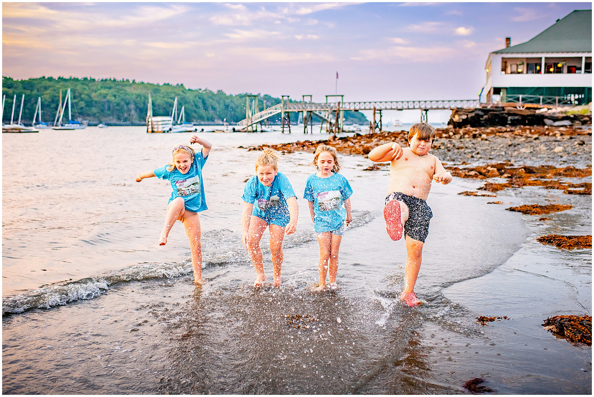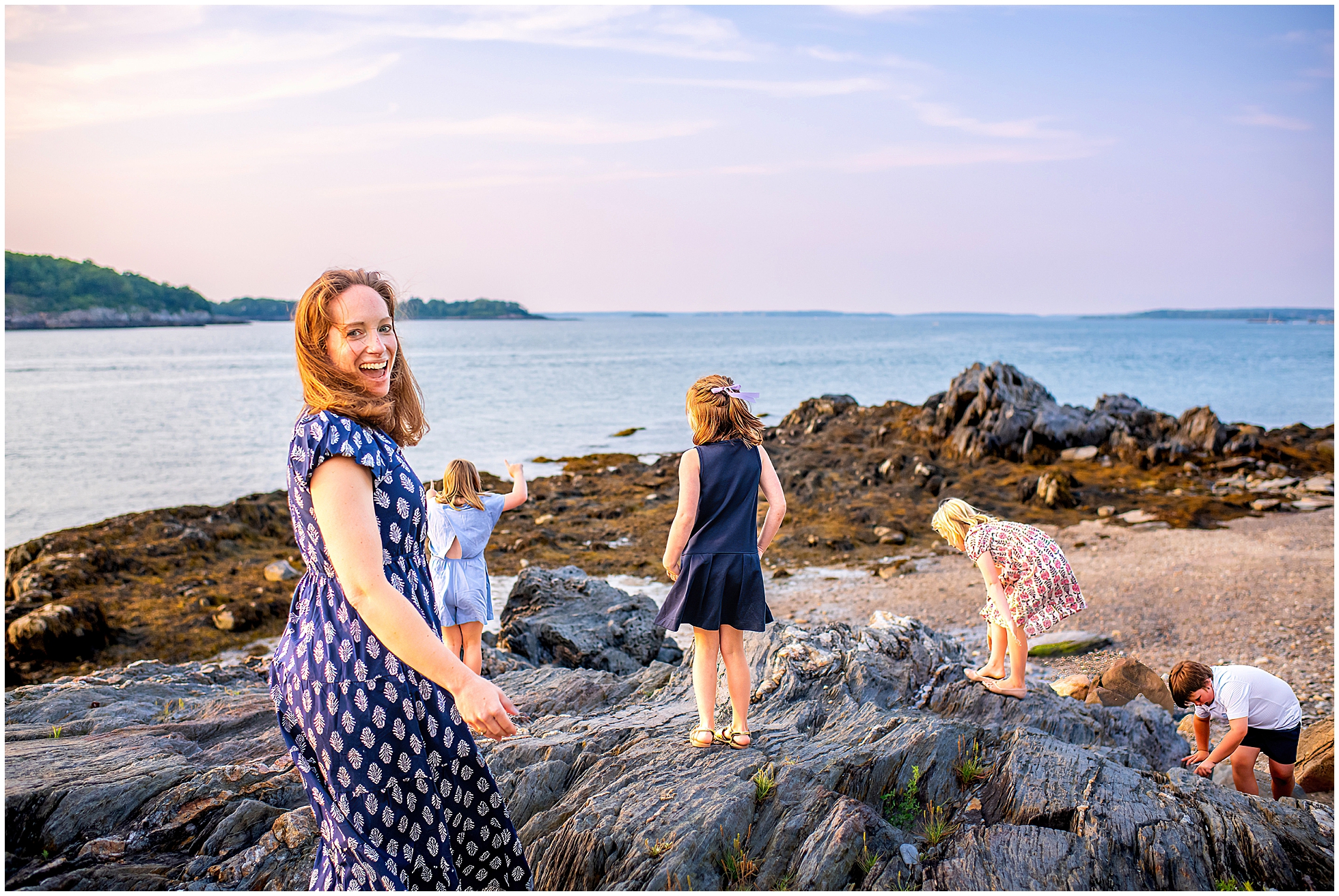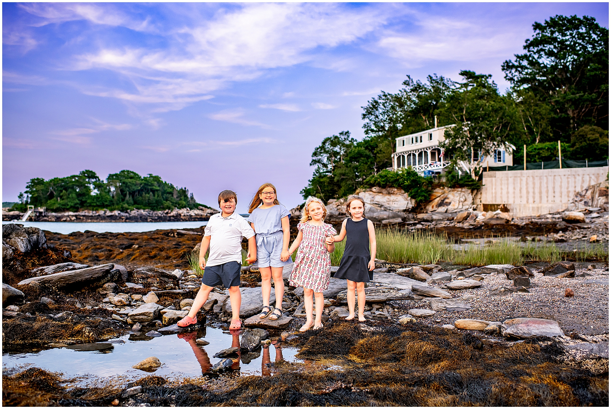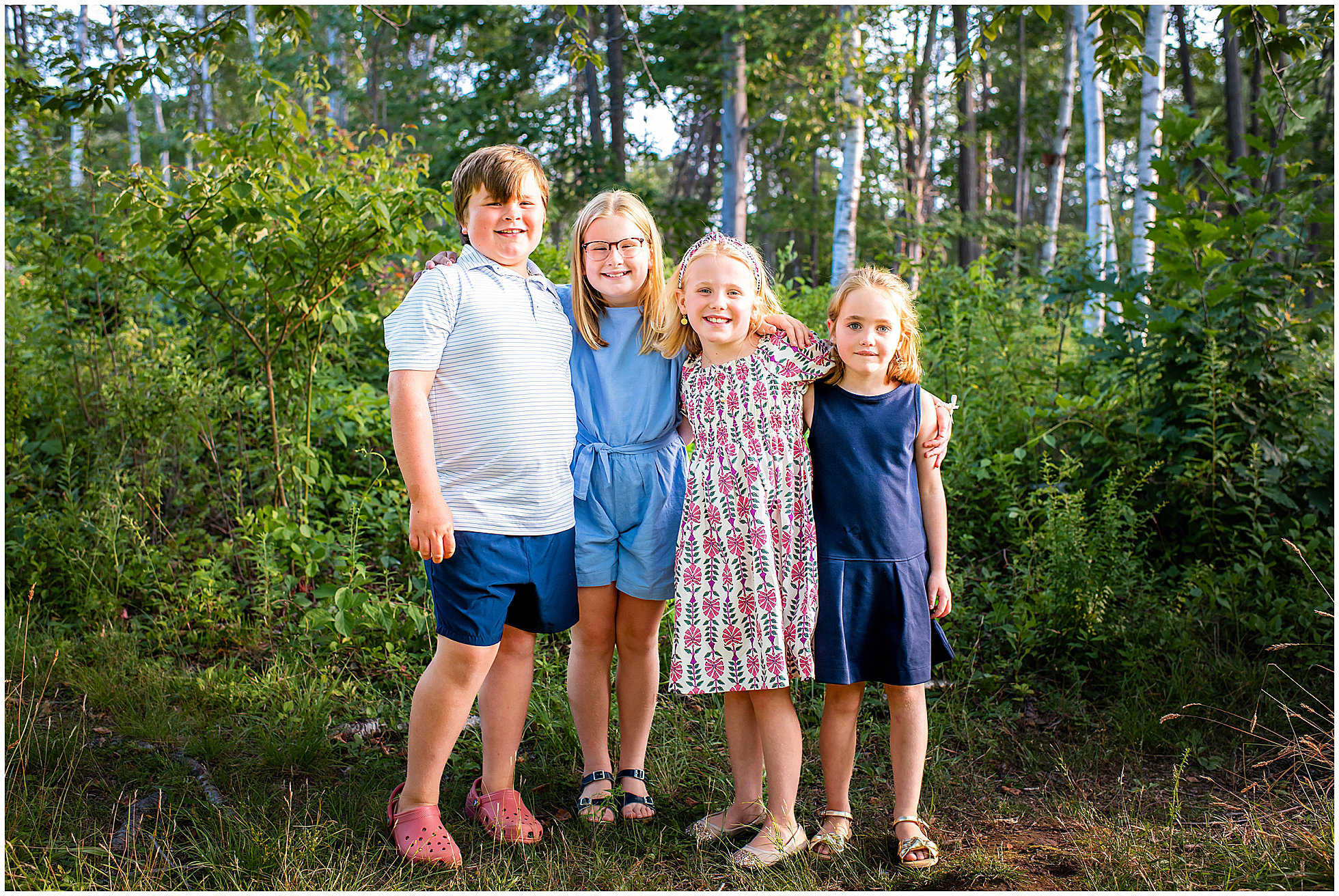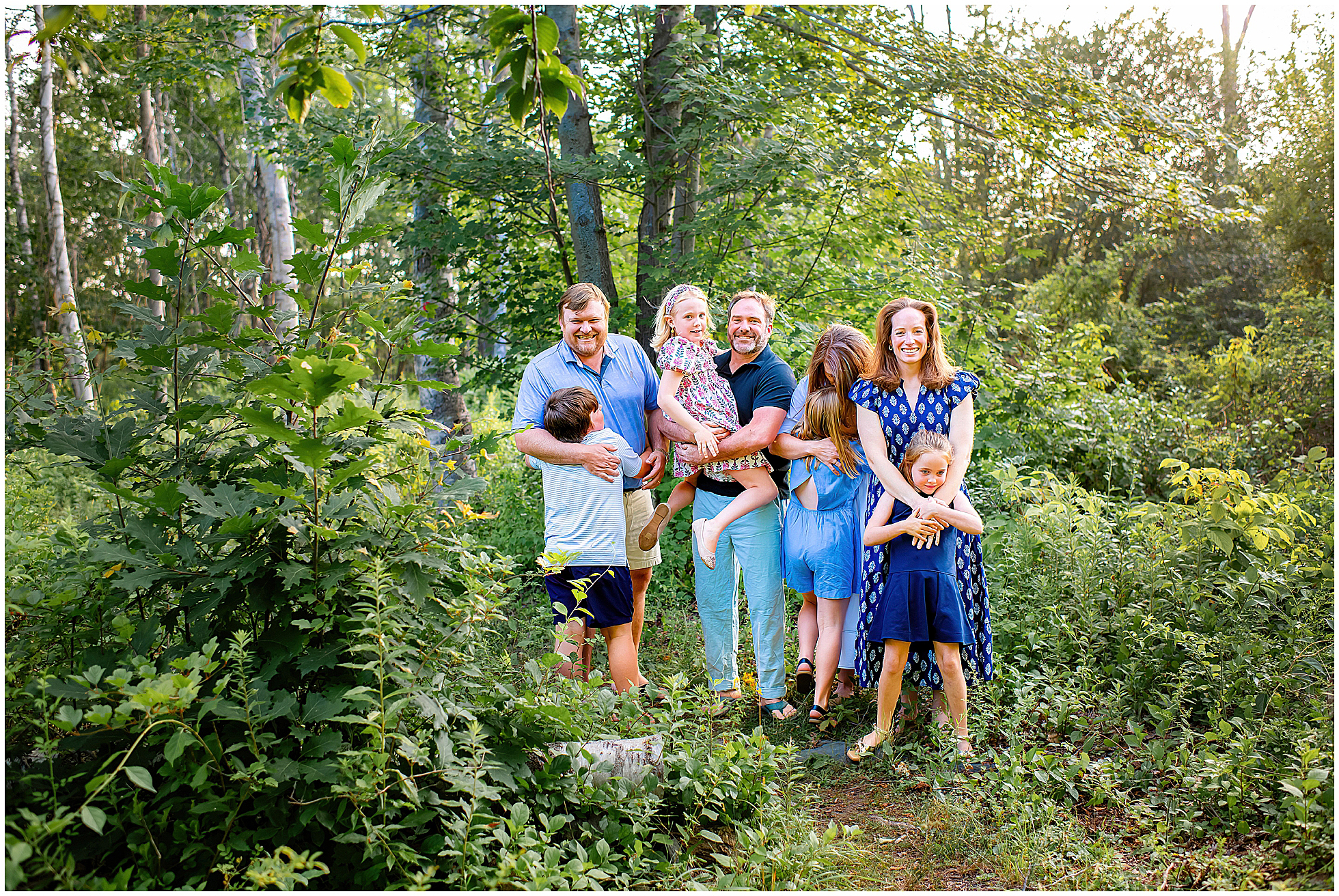 I took a little blogging and social media hiatus last week to get caught up (so many sessions! So few editing hours!), and I can think of no better way to come back online this week than with the F and G Families. For six years now I have had the pleasure of photographing these two families together as they travel to Maine for their annual summer getaway from their homes in Virginia and North Carolina. I’ve always appreciated how easy and how fun it is to spend time with these guys and at this point, our two hour lifestyle and portrait sessions feel like hanging out and taking photos of friends. All four kiddos are so comfortable with the camera and our routine of exploring fun areas wherever we are while taking family and group photos in between, and I’m always sad to leave them all at the end of our time together. This year was our fourth session on Peaks Island and we explored areas that were new to me in the woods of the island, before heading to a sandy beach on the north side, and finally doing a little splashing at the very end before I took the ferry back to Portland. It was a hazy night, but a gorgeous one on the island, and another one for the books with these really special families. I love capturing their Maine adventures and am so grateful for year six with this crew.