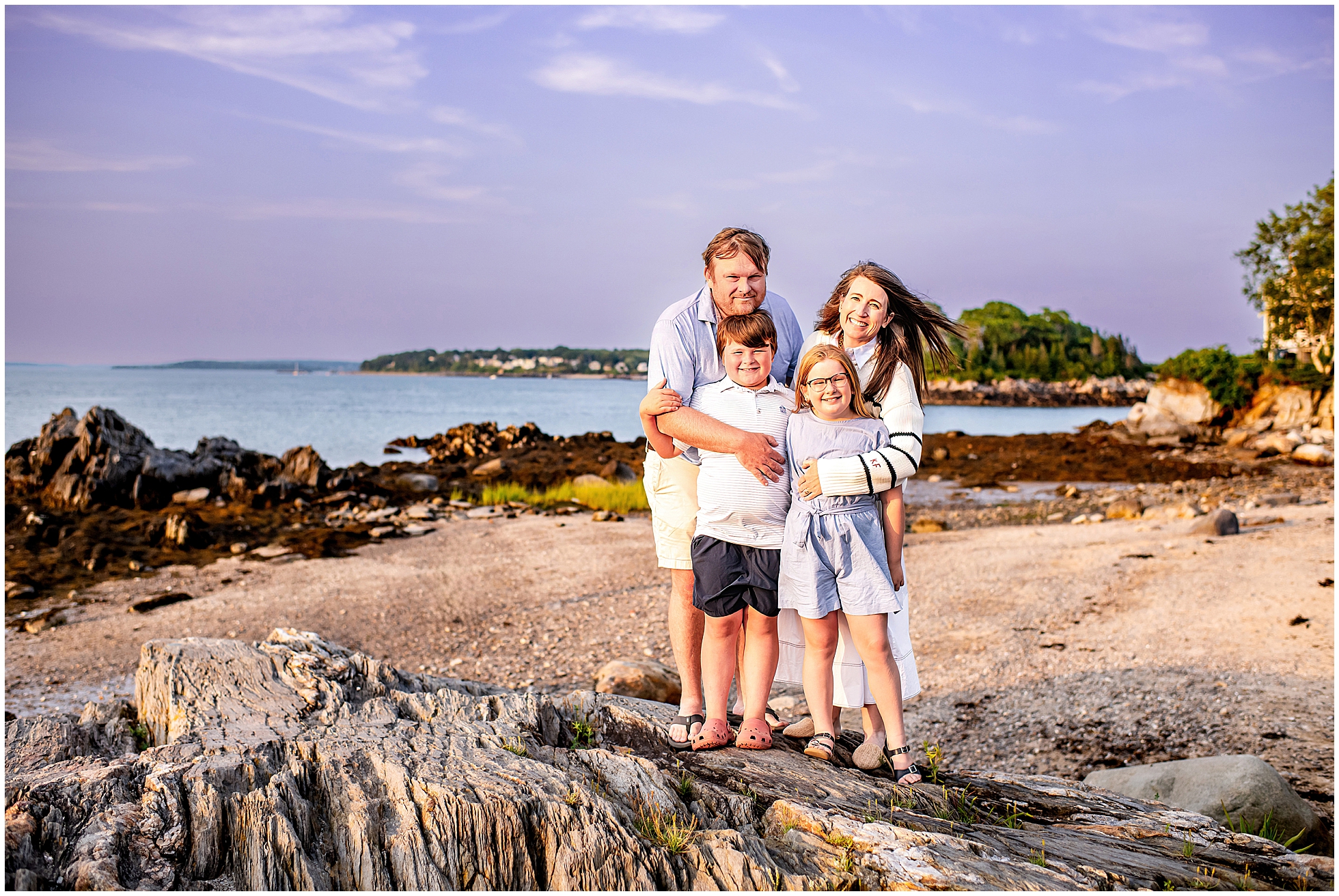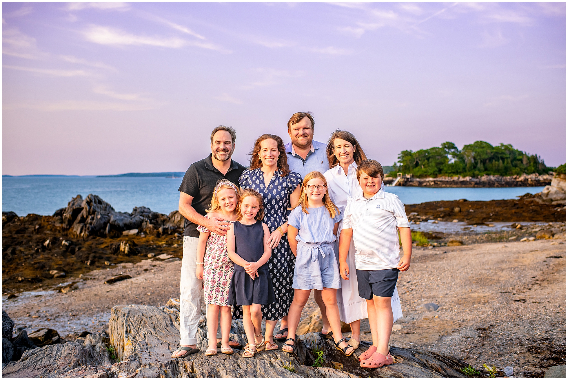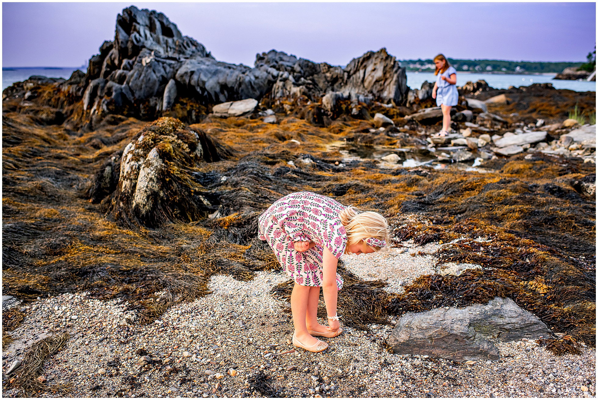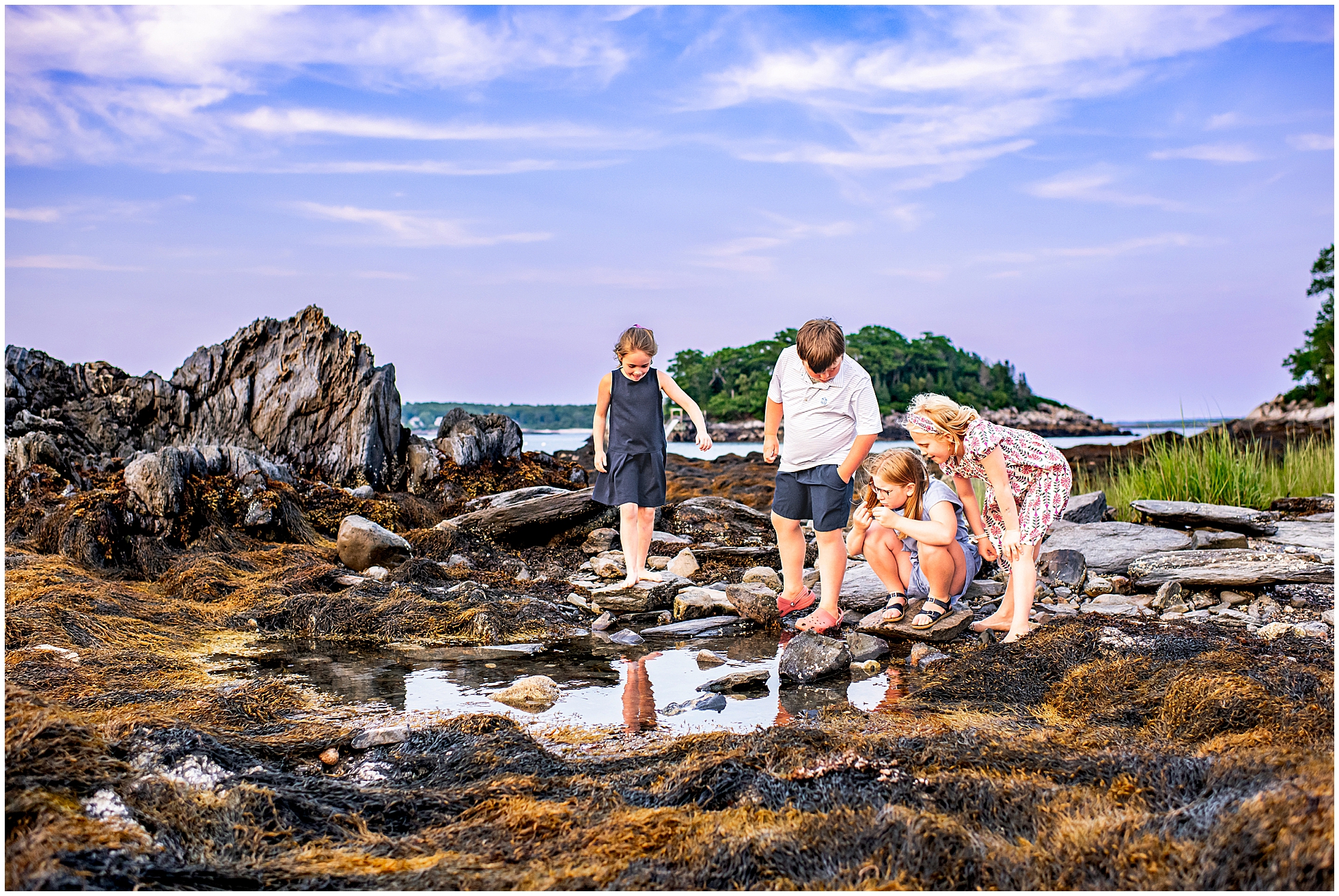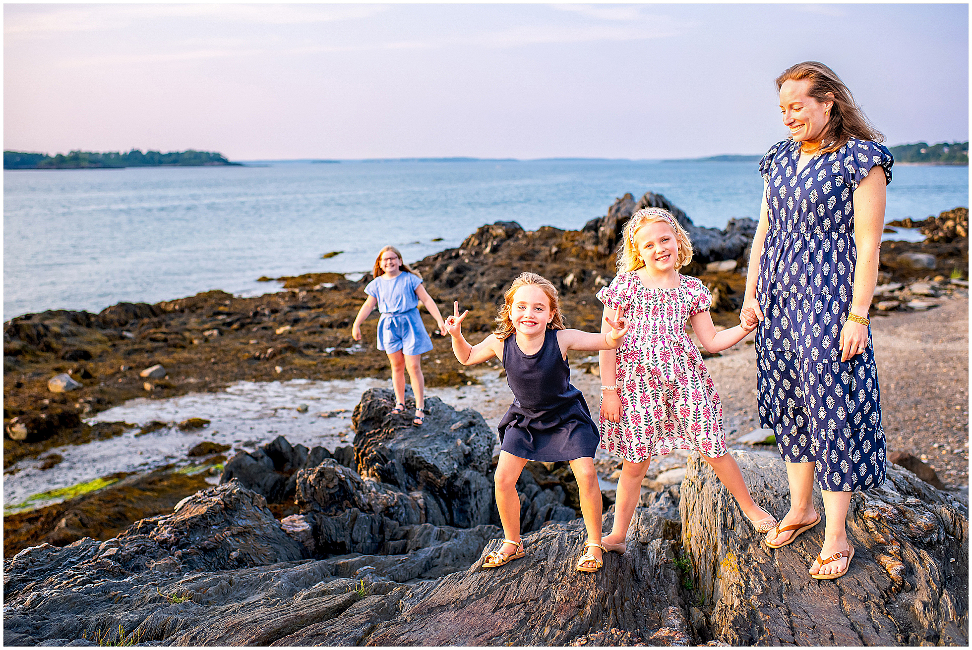 I took a little blogging and social media hiatus last week to get caught up (so many sessions! So few editing hours!), and I can think of no better way to come back online this week than with the F and G Families. For six years now I have had the pleasure of photographing these two families together as they travel to Maine for their annual summer getaway from their homes in Virginia and North Carolina. I’ve always appreciated how easy and how fun it is to spend time with these guys and at this point, our two hour lifestyle and portrait sessions feel like hanging out and taking photos of friends. All four kiddos are so comfortable with the camera and our routine of exploring fun areas wherever we are while taking family and group photos in between, and I’m always sad to leave them all at the end of our time together. This year was our fourth session on Peaks Island and we explored areas that were new to me in the woods of the island, before heading to a sandy beach on the north side, and finally doing a little splashing at the very end before I took the ferry back to Portland. It was a hazy night, but a gorgeous one on the island, and another one for the books with these really special families. I love capturing their Maine adventures and am so grateful for year six with this crew.