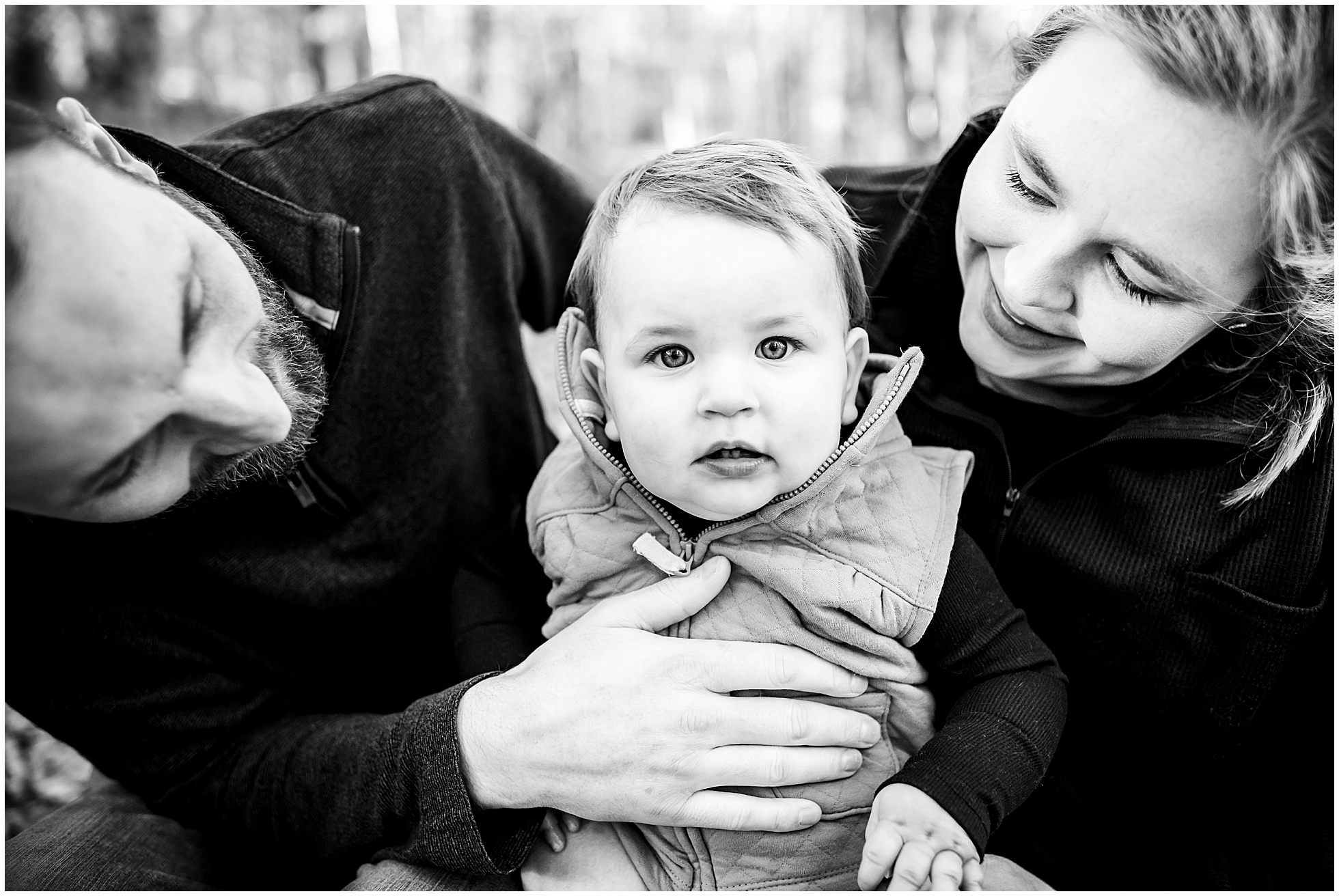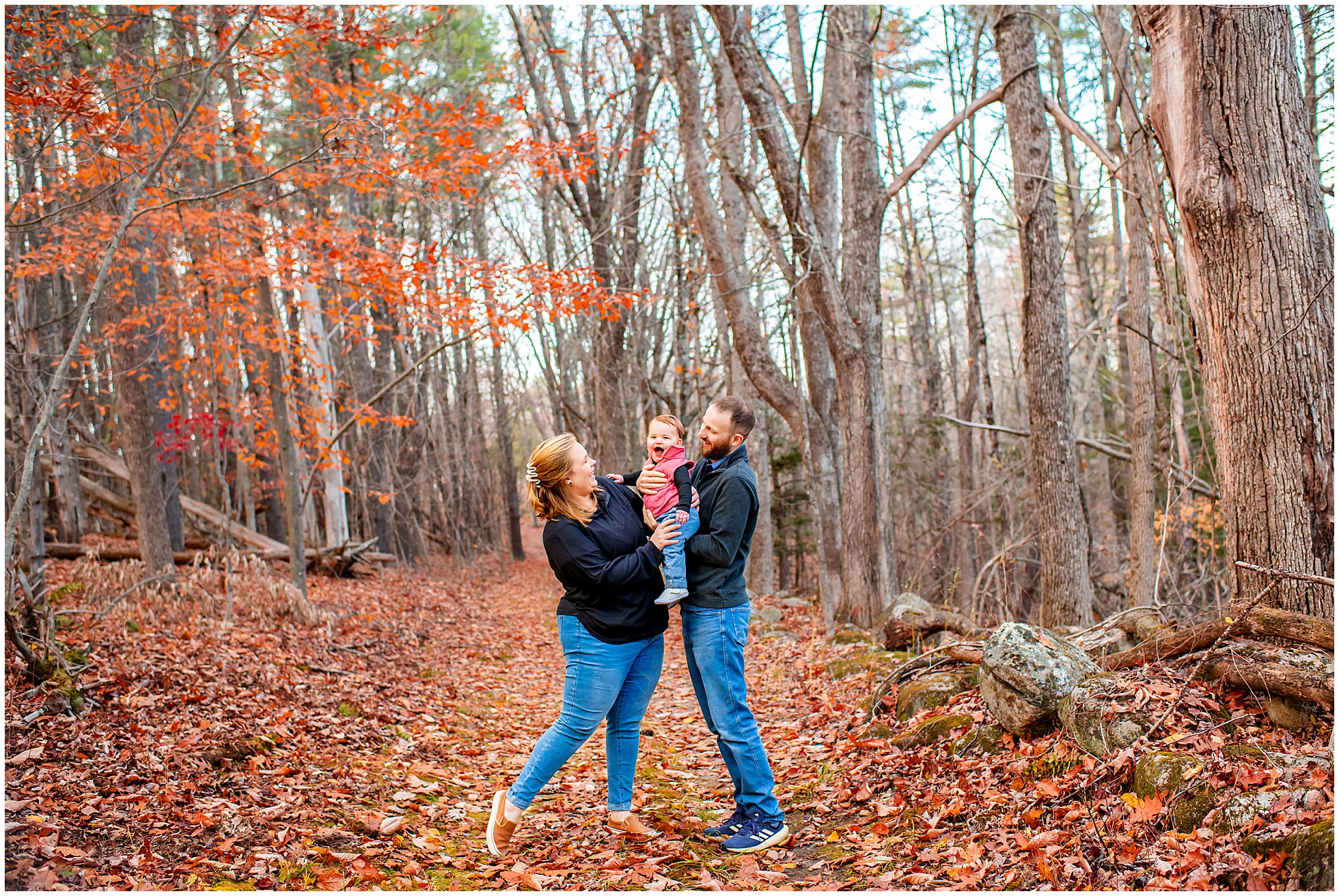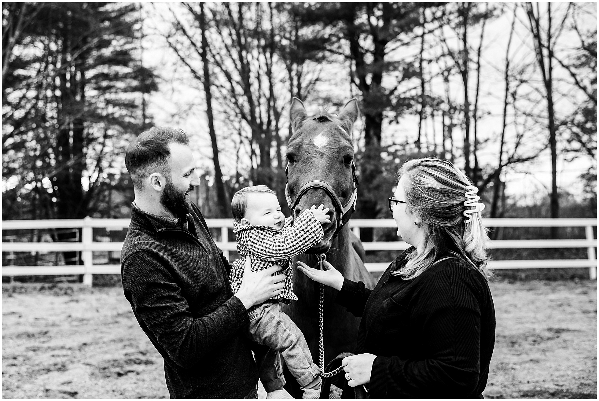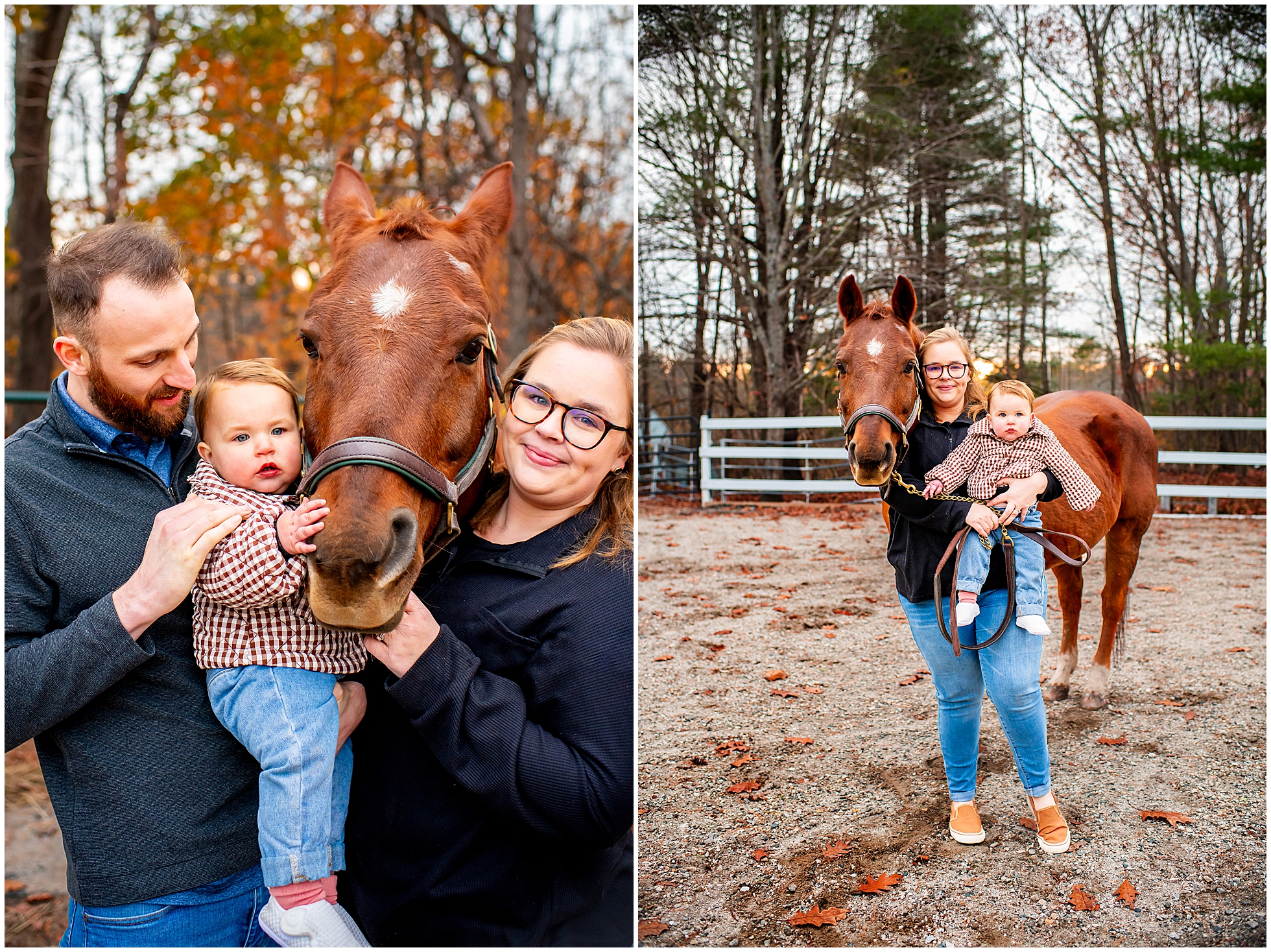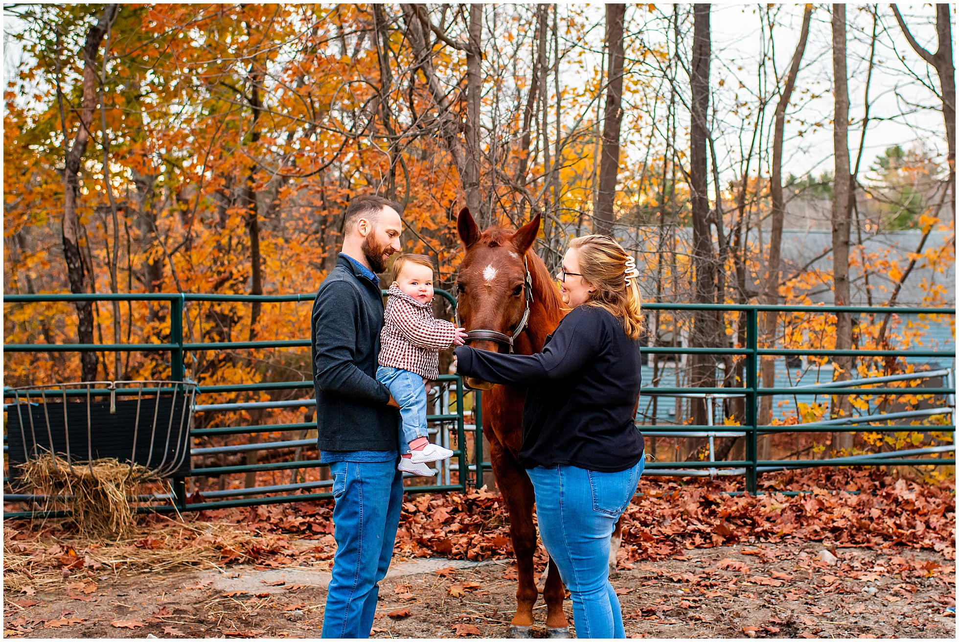 This year I had the honor of having Kimberlyn, Nick, and Mae in front of my cameras not once, but twice! After meeting sweet Mae for her newborn photos in November, 2024 I was so excited to see her again for my mini sessions in June. Of course she grew so much in seven months, and then again in the five months between our mini session and our fall photos in early November. This baby is SO DARN CUTE! I almost can’t even handle the cuteness. And with her mom being a photographer (the amazing eye behind KTB Creative Group), she is also not camera shy, she is actually quite the camera ham. Kim chose the woods behind her office and stable for our photos – a perfect location post-peak foliage, with a wide open trail and lovely soft late fall color. After exploring the woods, we headed to the stable for some photos with her horse, Skip. It’s been a little while since I’ve been around horses, so while I was a little nervous, I was amazed by how at ease all three of them were around Skip, especially Mae who has definitely chosen him as her furry friend. Seeing her eyes light up every time she approached him was absolutely beautiful, and I know it warms Kim’s heart even more than it did mine. I have so loved getting to capture some of Mae’s first year of life, and Kim and Nick’s first year of parenthood. These three are such a blast to photograph, so easy and wonderful to work with, and such a sweet and special family. I am so happy to have had another session with them in 2025. 💕