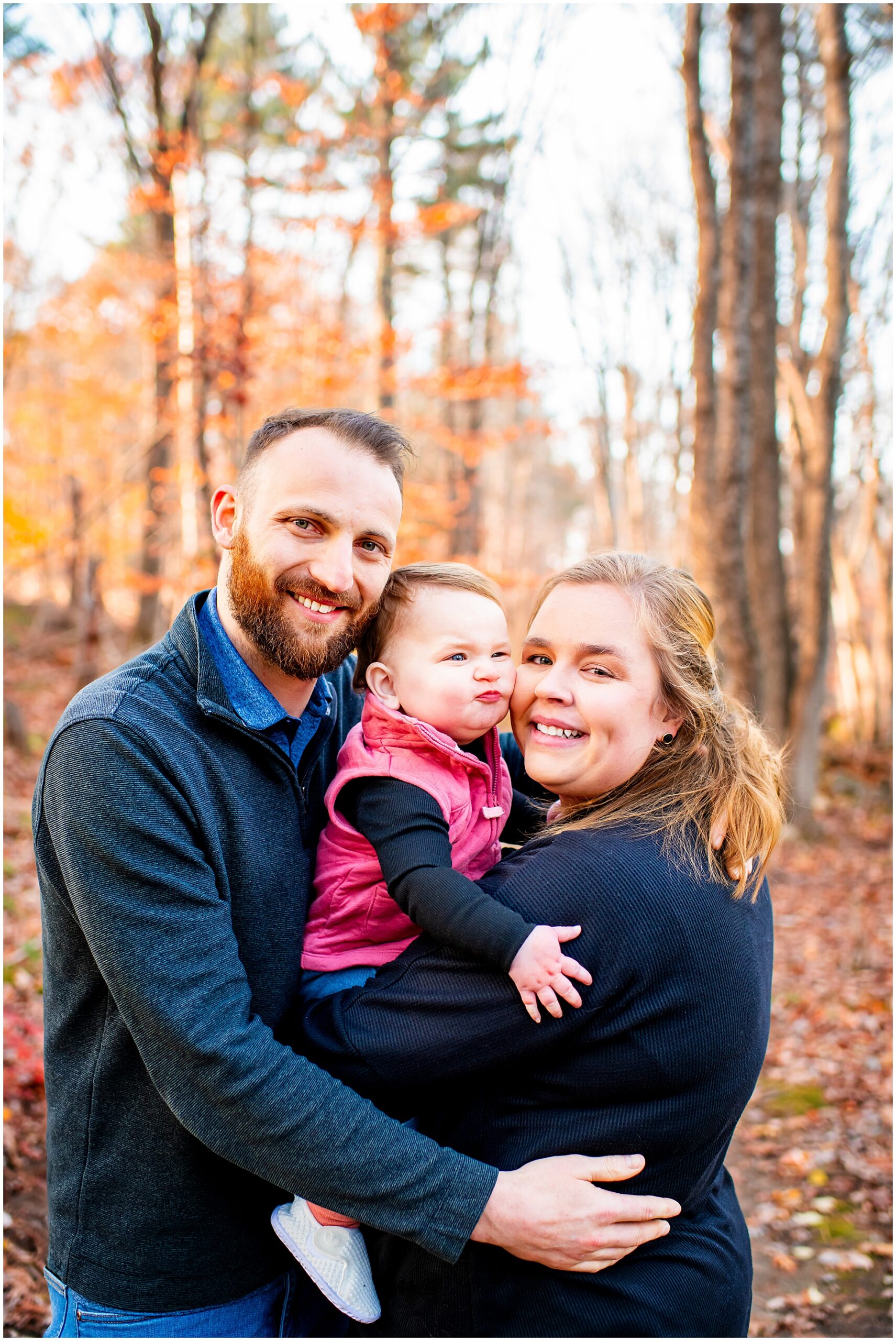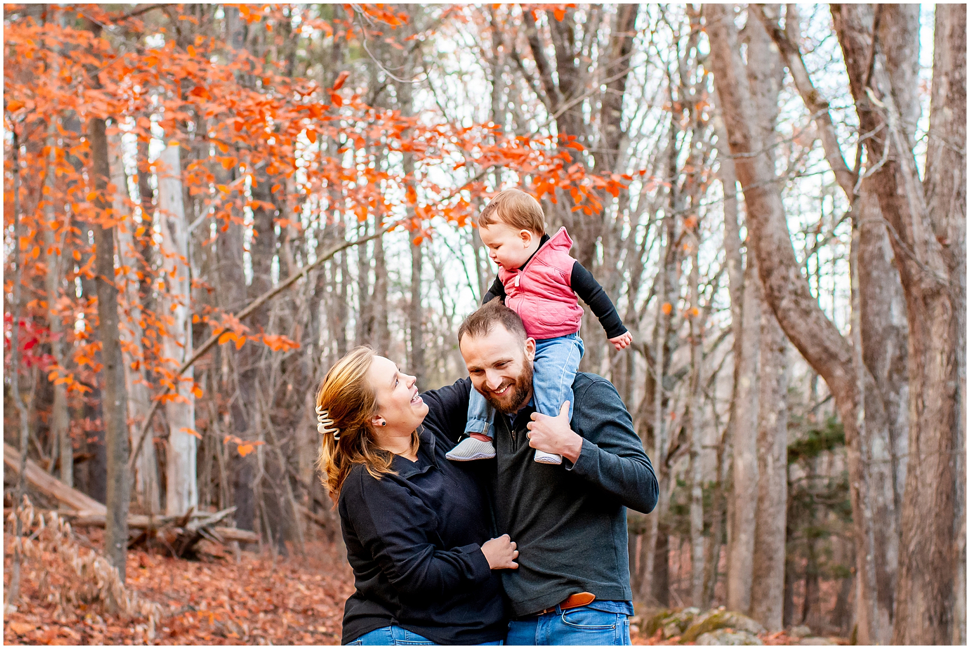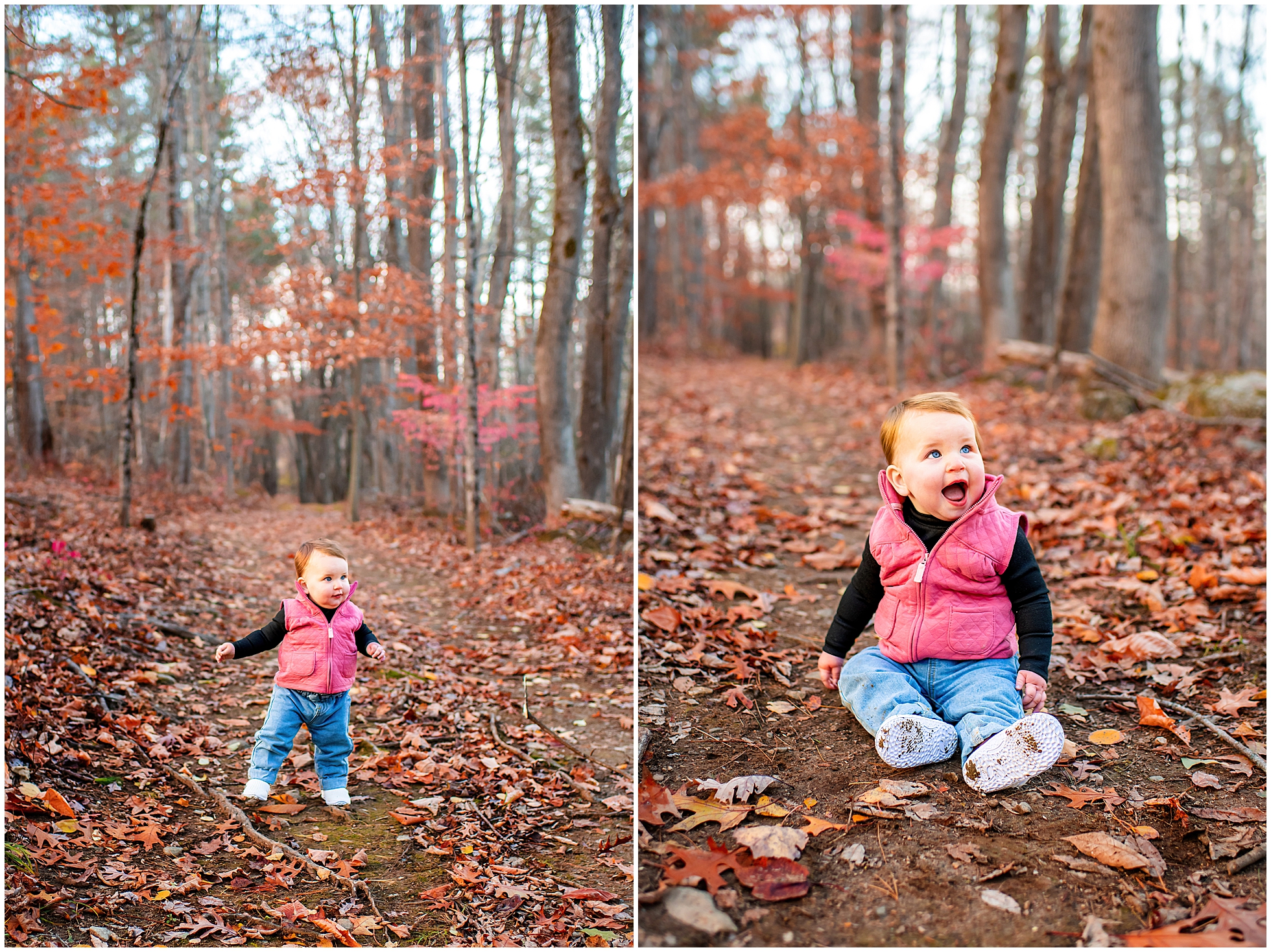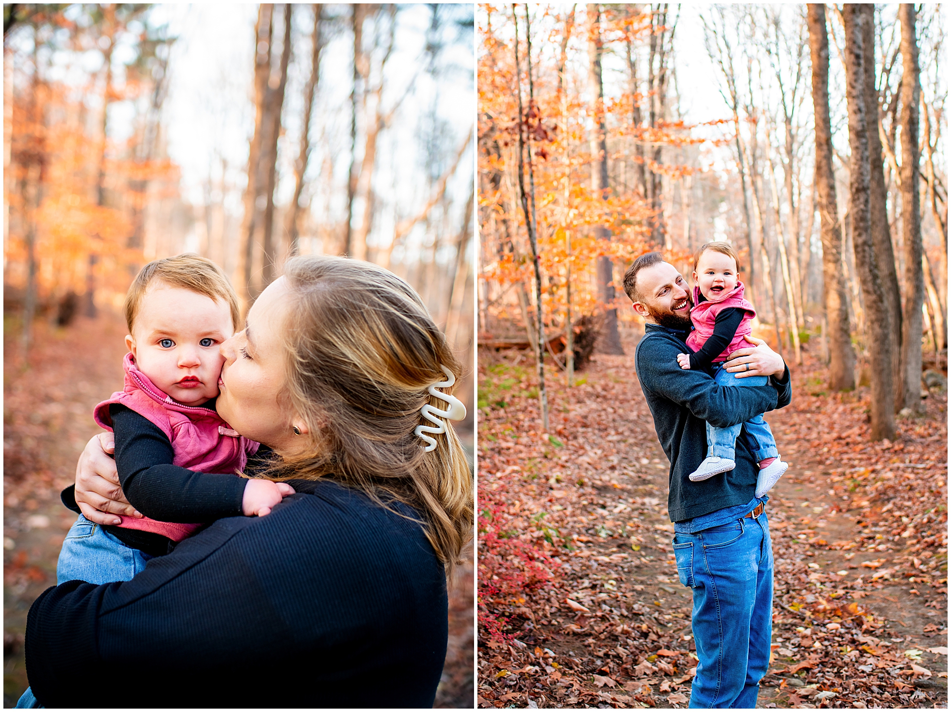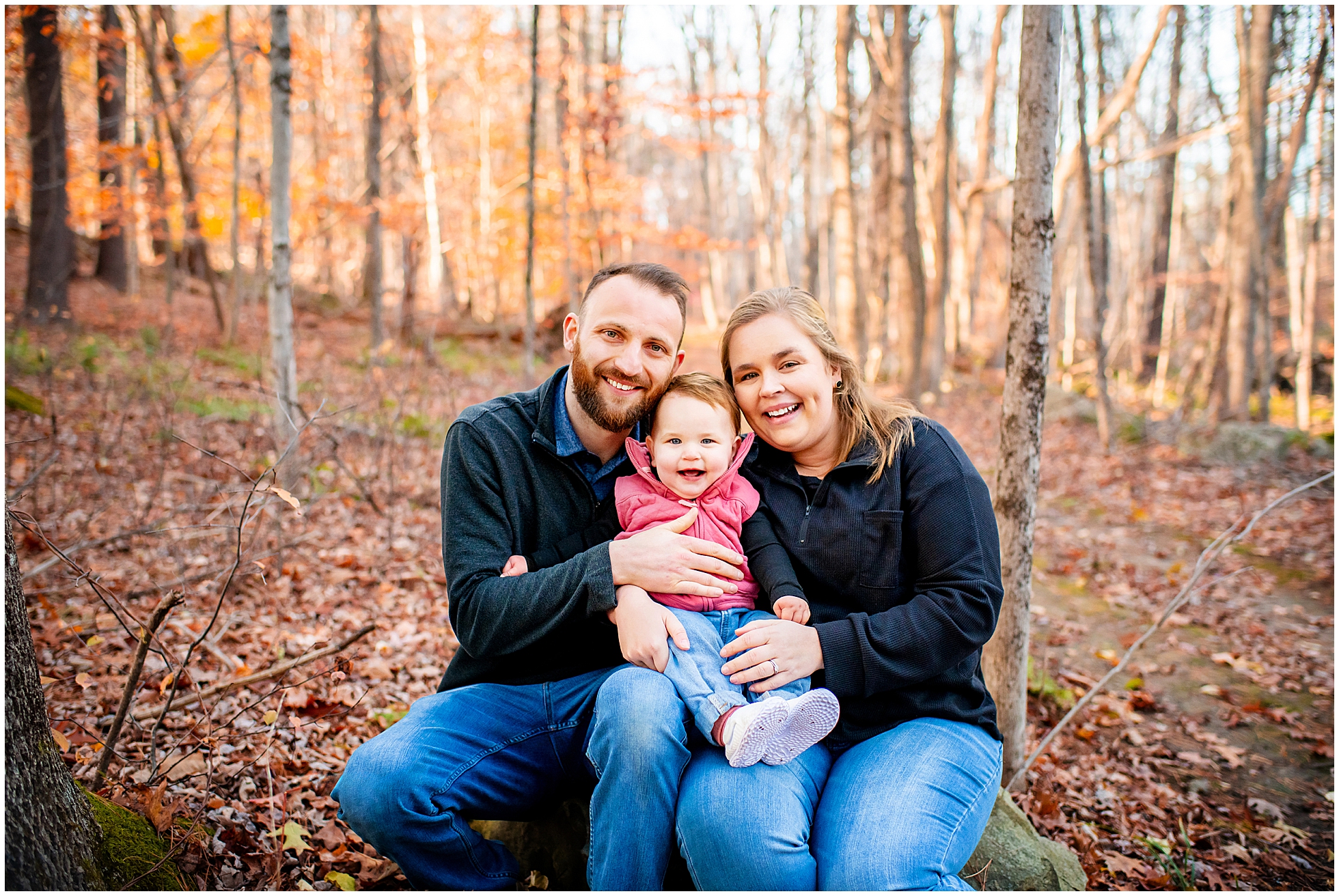 This year I had the honor of having Kimberlyn, Nick, and Mae in front of my cameras not once, but twice! After meeting sweet Mae for her newborn photos in November, 2024 I was so excited to see her again for my mini sessions in June. Of course she grew so much in seven months, and then again in the five months between our mini session and our fall photos in early November. This baby is SO DARN CUTE! I almost can’t even handle the cuteness. And with her mom being a photographer (the amazing eye behind KTB Creative Group), she is also not camera shy, she is actually quite the camera ham. Kim chose the woods behind her office and stable for our photos – a perfect location post-peak foliage, with a wide open trail and lovely soft late fall color. After exploring the woods, we headed to the stable for some photos with her horse, Skip. It’s been a little while since I’ve been around horses, so while I was a little nervous, I was amazed by how at ease all three of them were around Skip, especially Mae who has definitely chosen him as her furry friend. Seeing her eyes light up every time she approached him was absolutely beautiful, and I know it warms Kim’s heart even more than it did mine. I have so loved getting to capture some of Mae’s first year of life, and Kim and Nick’s first year of parenthood. These three are such a blast to photograph, so easy and wonderful to work with, and such a sweet and special family. I am so happy to have had another session with them in 2025. 💕