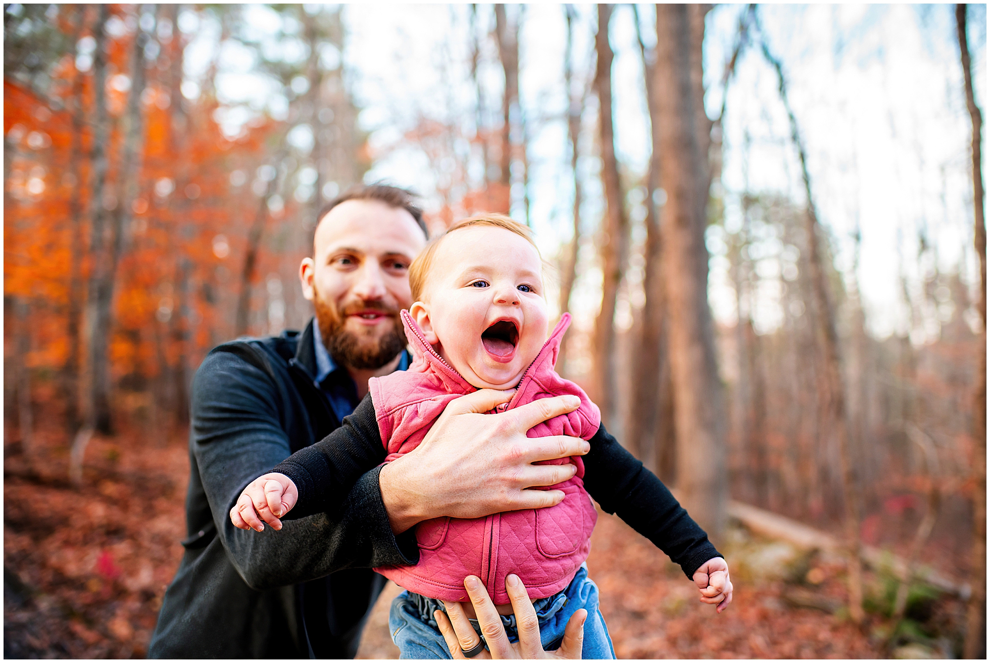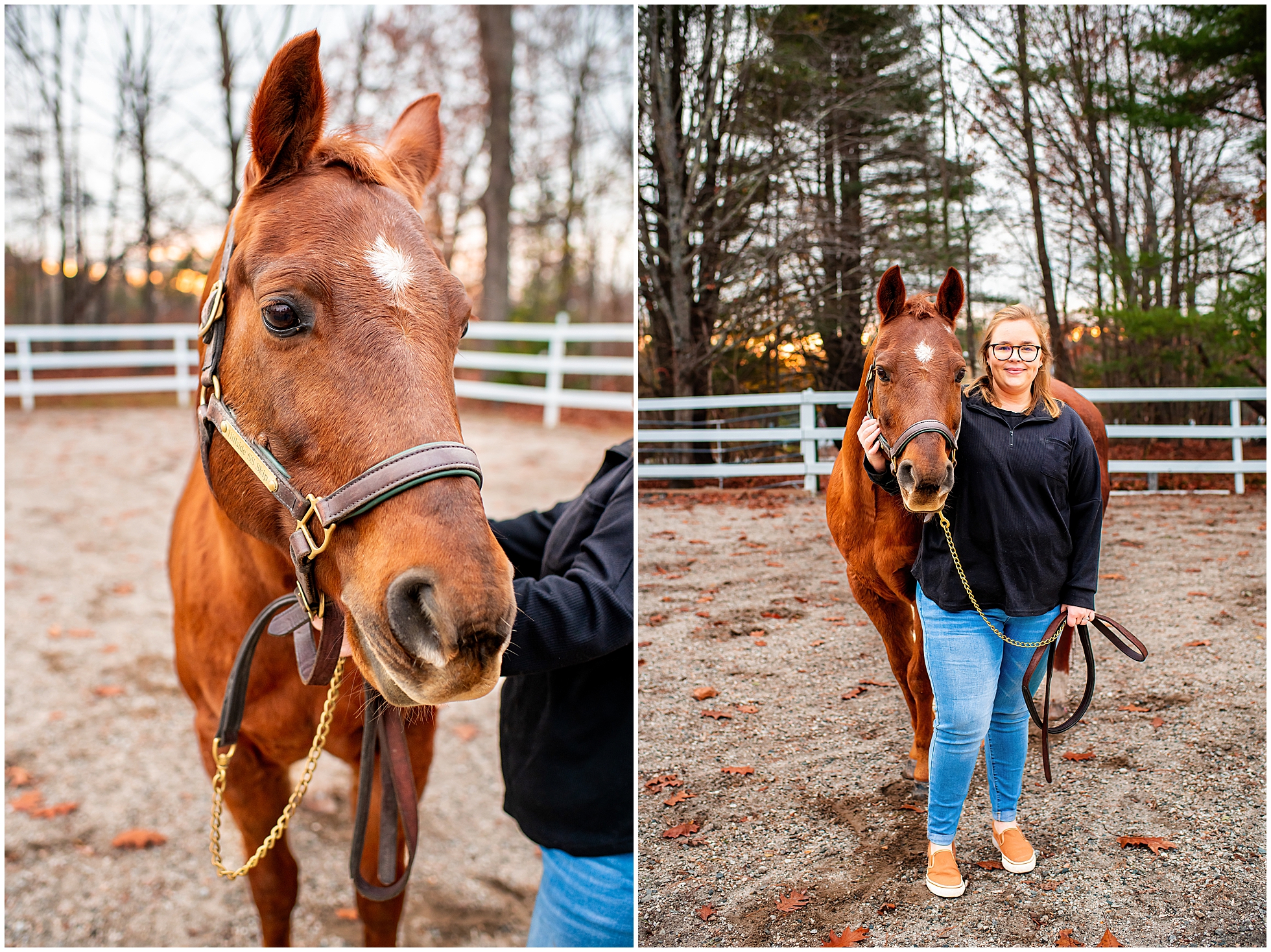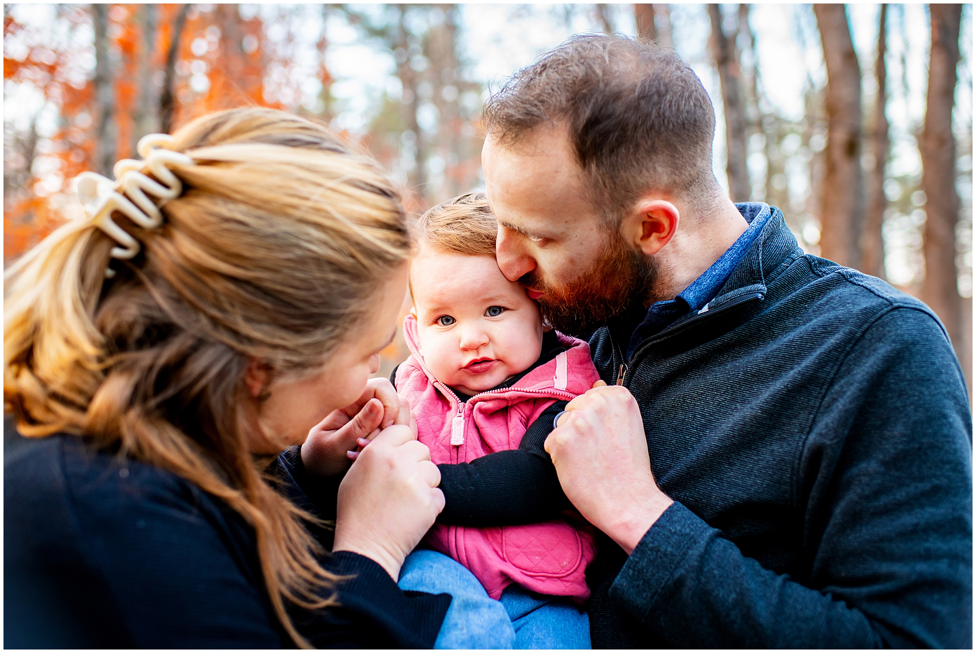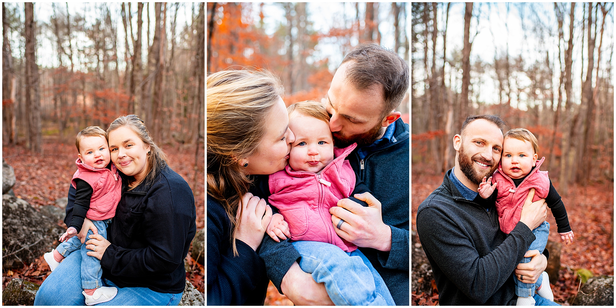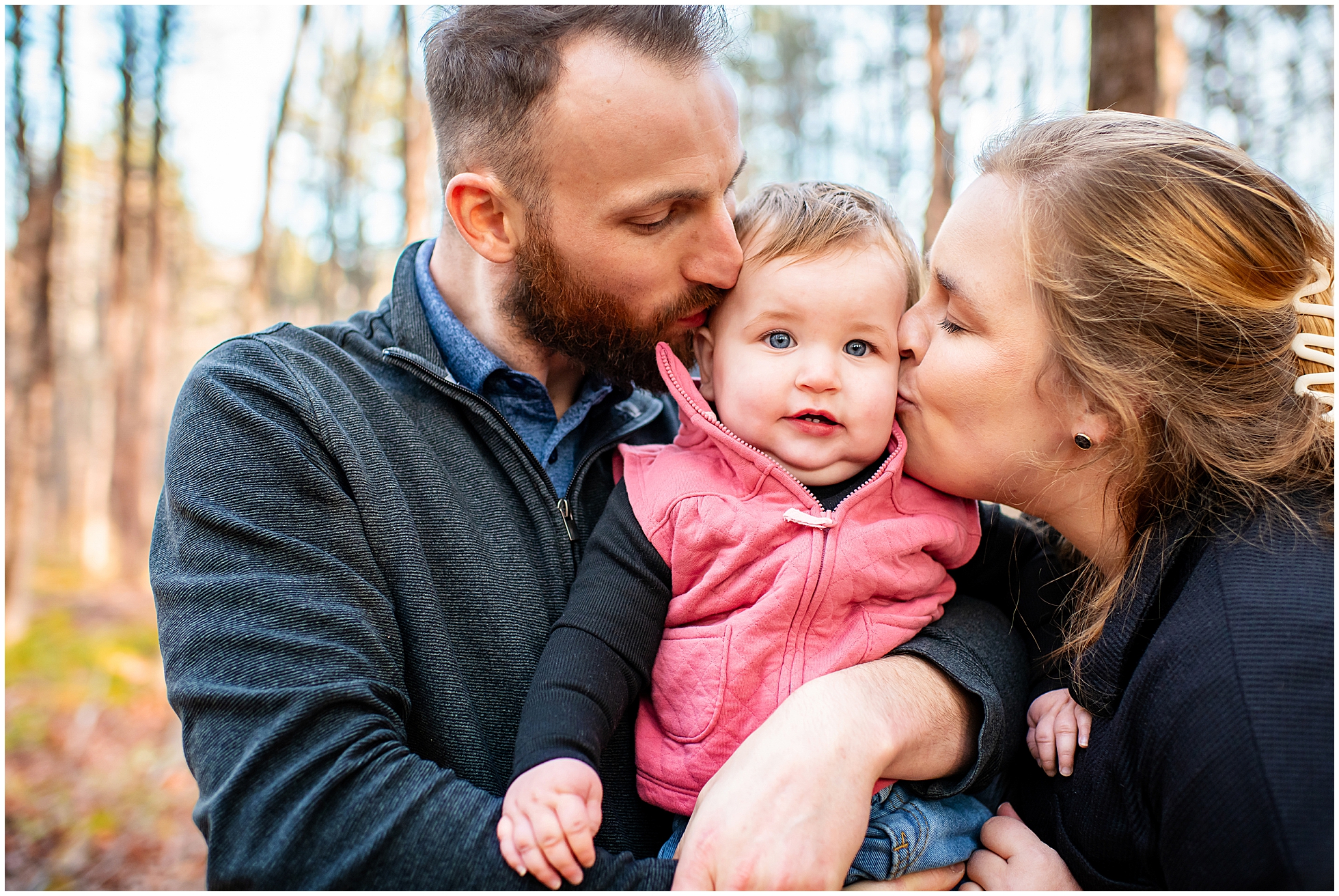 This year I had the honor of having Kimberlyn, Nick, and Mae in front of my cameras not once, but twice! After meeting sweet Mae for her newborn photos in November, 2024 I was so excited to see her again for my mini sessions in June. Of course she grew so much in seven months, and then again in the five months between our mini session and our fall photos in early November. This baby is SO DARN CUTE! I almost can’t even handle the cuteness. And with her mom being a photographer (the amazing eye behind KTB Creative Group), she is also not camera shy, she is actually quite the camera ham. Kim chose the woods behind her office and stable for our photos – a perfect location post-peak foliage, with a wide open trail and lovely soft late fall color. After exploring the woods, we headed to the stable for some photos with her horse, Skip. It’s been a little while since I’ve been around horses, so while I was a little nervous, I was amazed by how at ease all three of them were around Skip, especially Mae who has definitely chosen him as her furry friend. Seeing her eyes light up every time she approached him was absolutely beautiful, and I know it warms Kim’s heart even more than it did mine. I have so loved getting to capture some of Mae’s first year of life, and Kim and Nick’s first year of parenthood. These three are such a blast to photograph, so easy and wonderful to work with, and such a sweet and special family. I am so happy to have had another session with them in 2025. 💕
