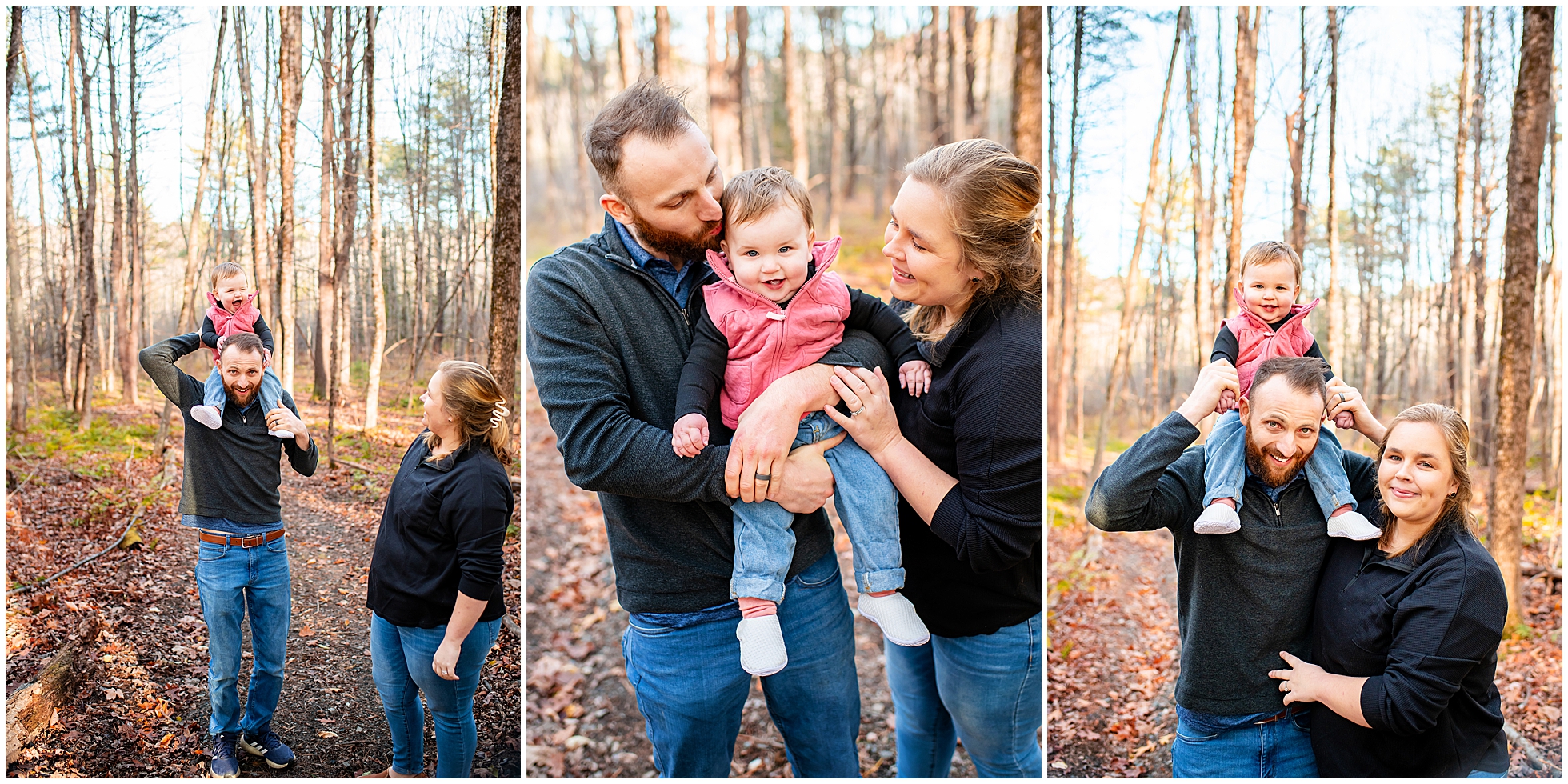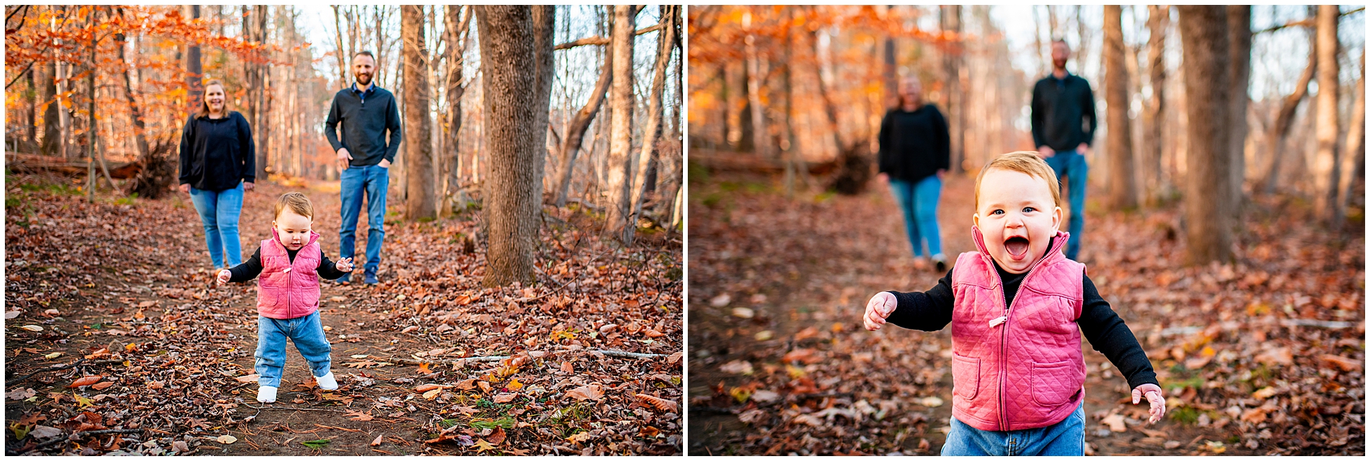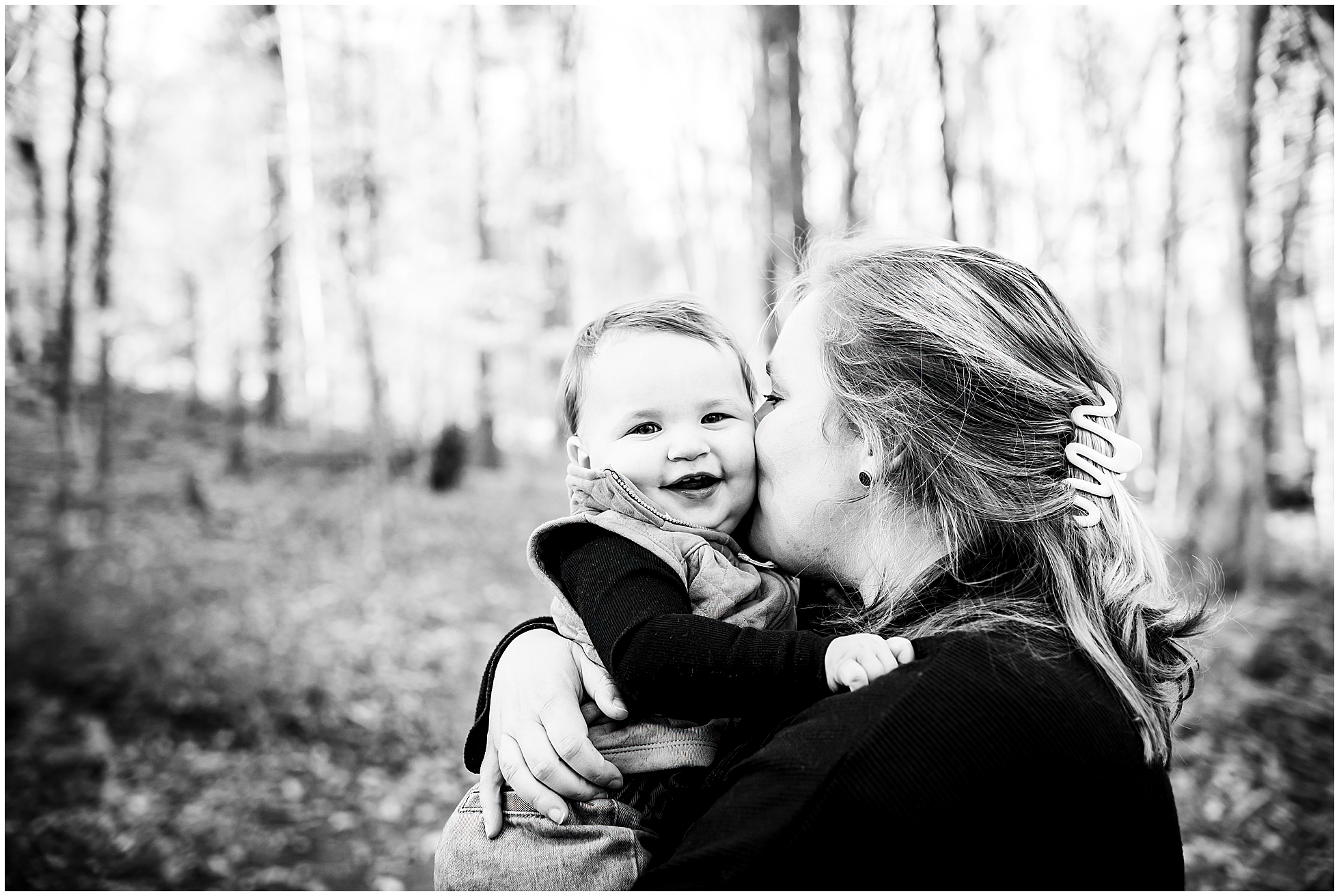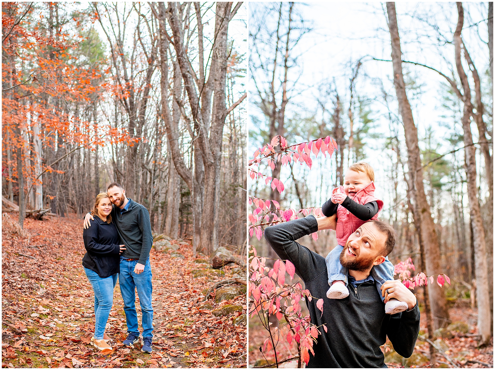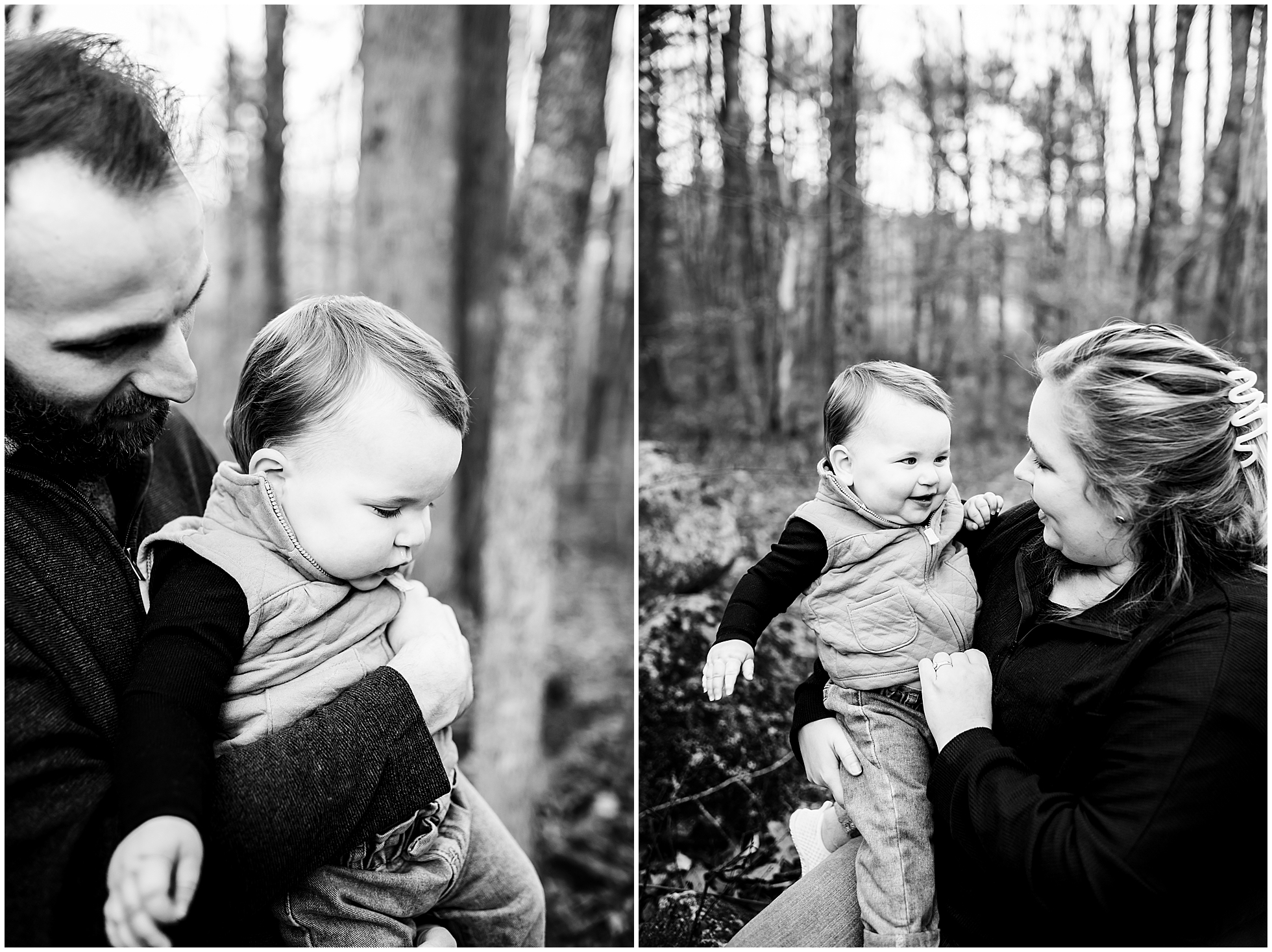 This year I had the honor of having Kimberlyn, Nick, and Mae in front of my cameras not once, but twice! After meeting sweet Mae for her newborn photos in November, 2024 I was so excited to see her again for my mini sessions in June. Of course she grew so much in seven months, and then again in the five months between our mini session and our fall photos in early November. This baby is SO DARN CUTE! I almost can’t even handle the cuteness. And with her mom being a photographer (the amazing eye behind KTB Creative Group), she is also not camera shy, she is actually quite the camera ham. Kim chose the woods behind her office and stable for our photos – a perfect location post-peak foliage, with a wide open trail and lovely soft late fall color. After exploring the woods, we headed to the stable for some photos with her horse, Skip. It’s been a little while since I’ve been around horses, so while I was a little nervous, I was amazed by how at ease all three of them were around Skip, especially Mae who has definitely chosen him as her furry friend. Seeing her eyes light up every time she approached him was absolutely beautiful, and I know it warms Kim’s heart even more than it did mine. I have so loved getting to capture some of Mae’s first year of life, and Kim and Nick’s first year of parenthood. These three are such a blast to photograph, so easy and wonderful to work with, and such a sweet and special family. I am so happy to have had another session with them in 2025. 💕